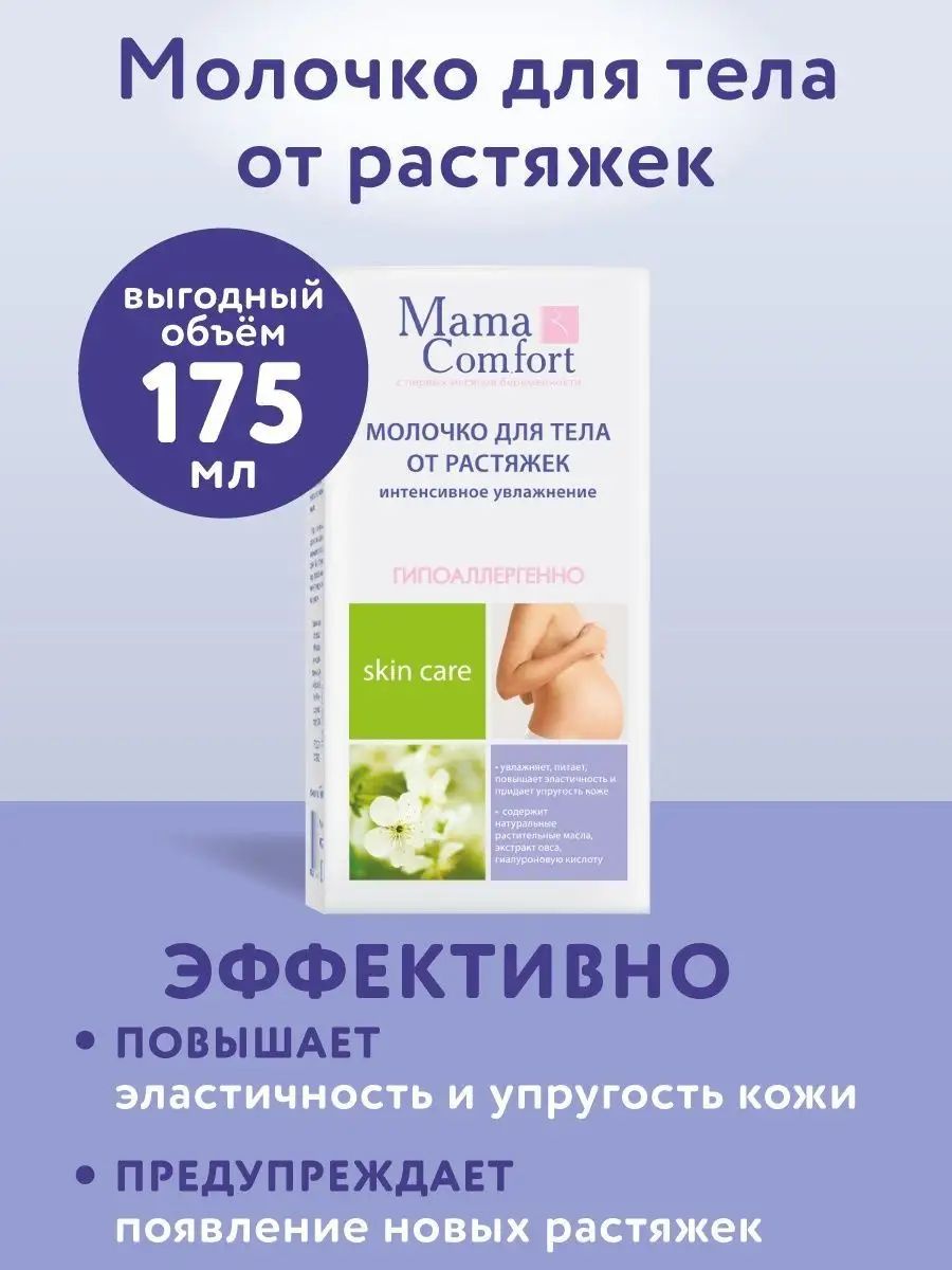 На протяжении всего периода беременности увлажняющее молочко для тела "Mama Com.fort" обеспечит нежный и мягкий уход за Вашей кожей. Благодаря специально подобранной и сбалансированной комбинации растительных масел - рисового, миндального, зародышей пшеницы, а также комплекса витаминов A, E, F, молочко идеально снимает сухость, сохраняет природную эластичность и нежность кожи. Молочко от растяжек особенно эффективно для беременных и мам, которые хотят избежать появления растяжек на коже. Оно помогает уменьшить видимость растяжек, а также предотвратить появление новых. Кроме того, молочко можно использовать для уменьшения видимости шрамов и рубцов на коже. Молочко, также, как и крем от растяжек, интенсивно питает и увлажняет кожу, нормализует гидролипидный баланс. Молочко содержит растительный сквалан, натуральные растительные масла, экстракт овса, гиалуроновую кислоту.