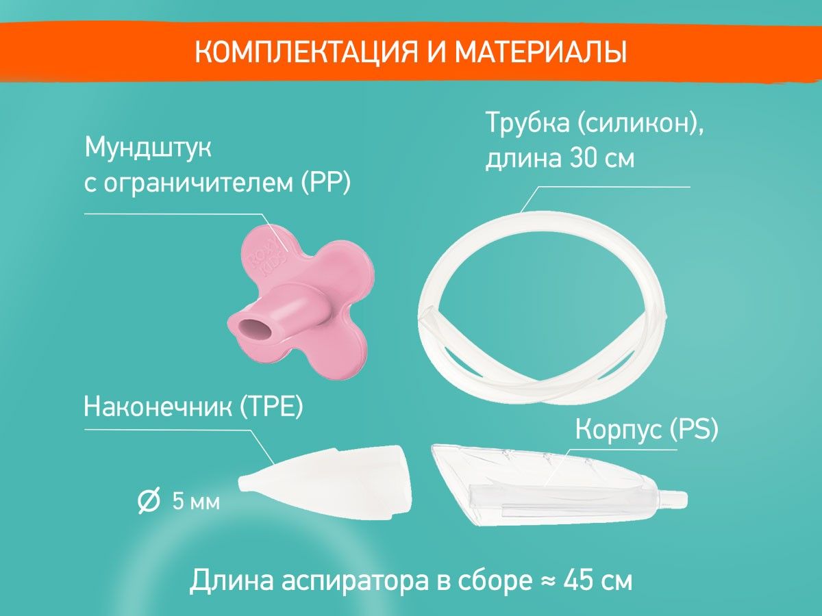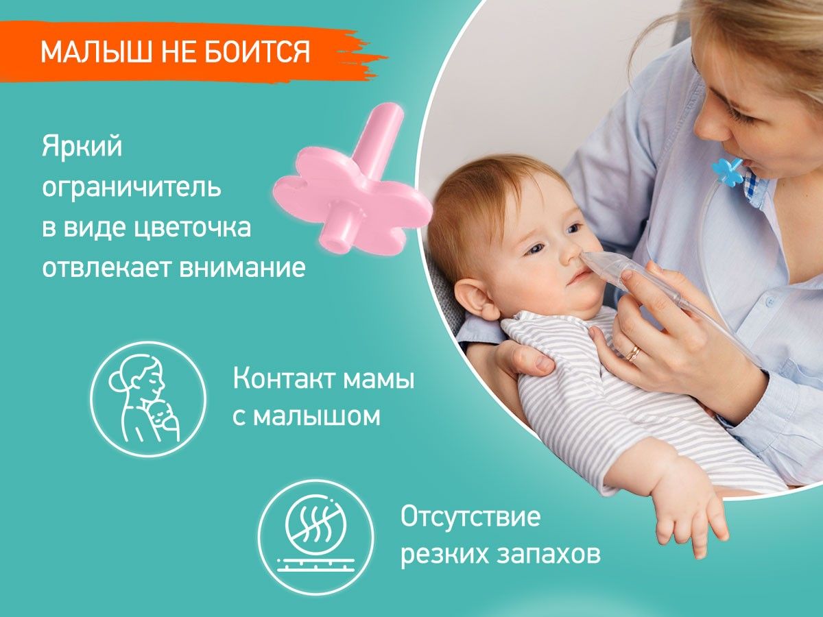 Назальный аспиратор для удаления слизи из носа с мягким наконечником является уникальной разработкой ROXY-KIDS с запатентованной конструкцией. Этот прибор легко и быстро поможет избавить носик новорожденного, грудного ребенка и детей младшего дошкольного возраста (до 3 лет) от заложенности. У аспиратора есть двухкамерная конструкция, которая не позволит слизи во время процедуры попасть в трубку и причинить вред или неудобства маме. Яркий ограничитель в виде цветочка привлекает внимание ребенка и позволяет маме удобно держать мундштук аспиратора во рту. Отсутствуют расходники в виде фильтров, одноразовых носиков и пр. Стерилизовать кипячением можно только наконечник данного аспиратора. Этот назальный аспиратор можно адаптировать для пылесоса с помощью специального набора аксессуаров от ROXY-KIDS, который продается отдельно.