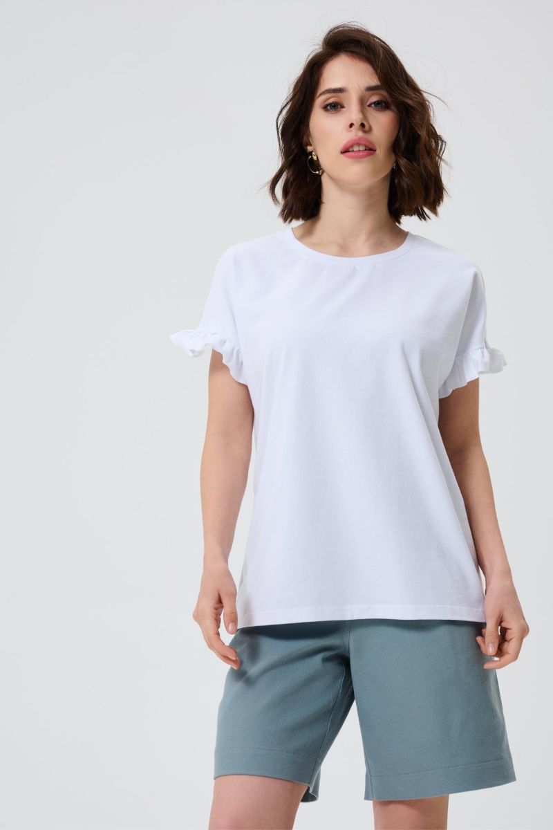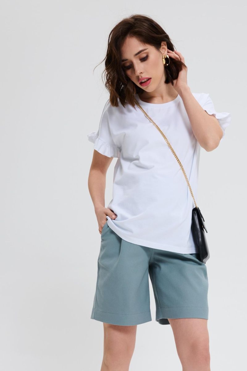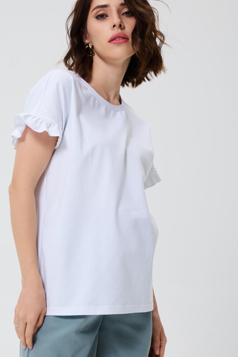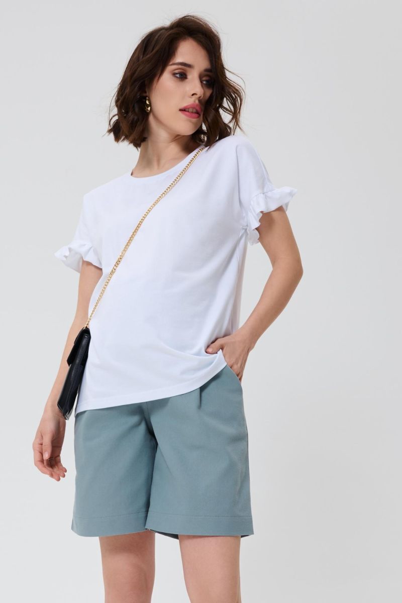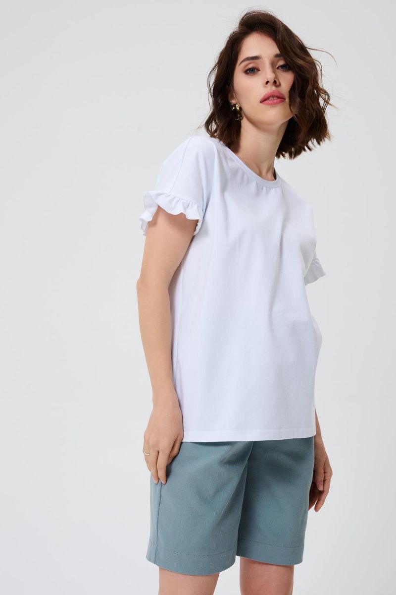 Спортивную лаконичность разбавляет романтичный рюш на коротких рукавах. Просторный крой позволит носить модель на всем сроке беременности и после родов. Универсальный цвет модели отлично подходит для лета - в белой футболке будет комфортно в жаркий сезон.