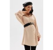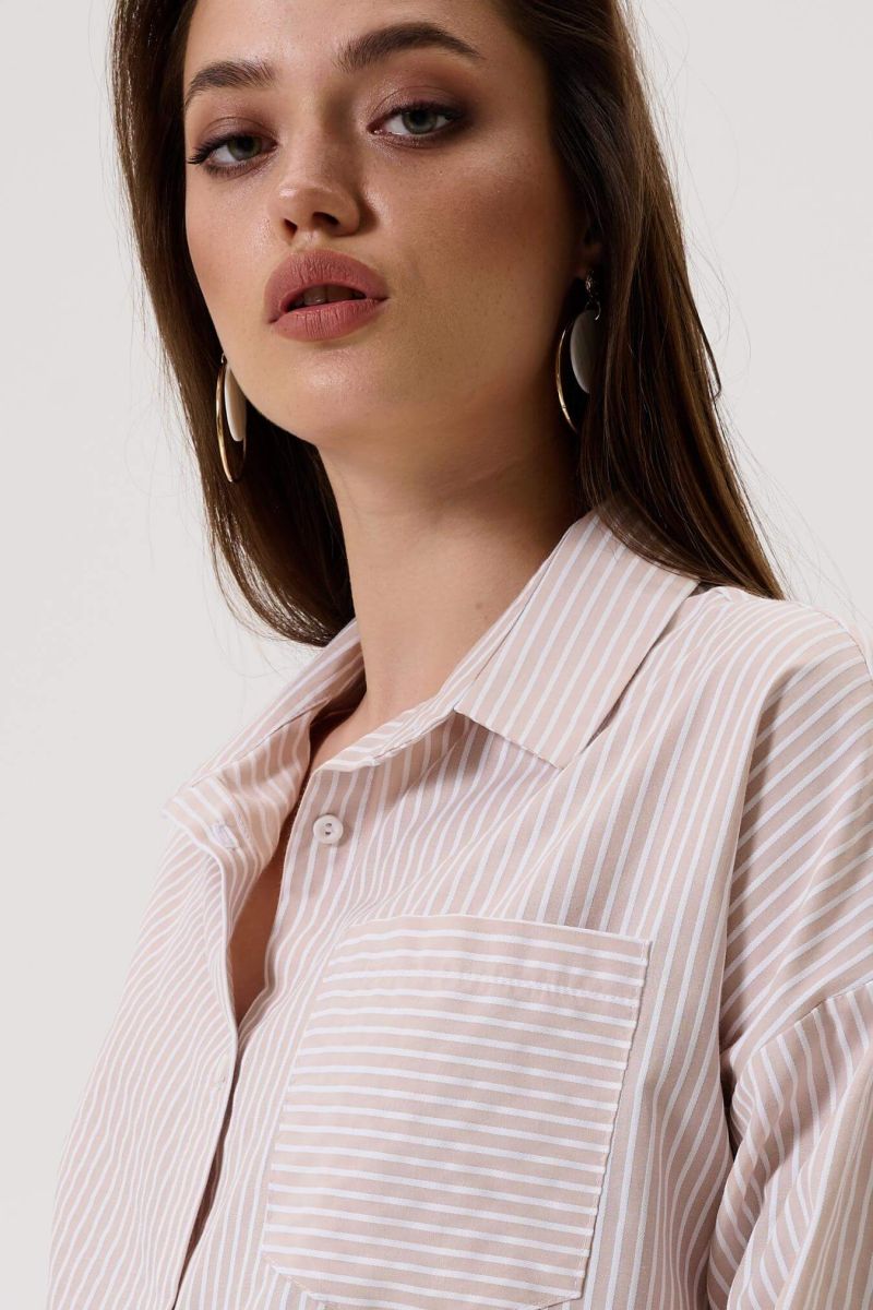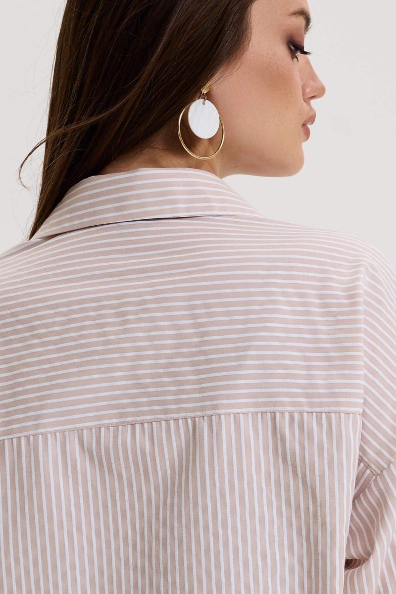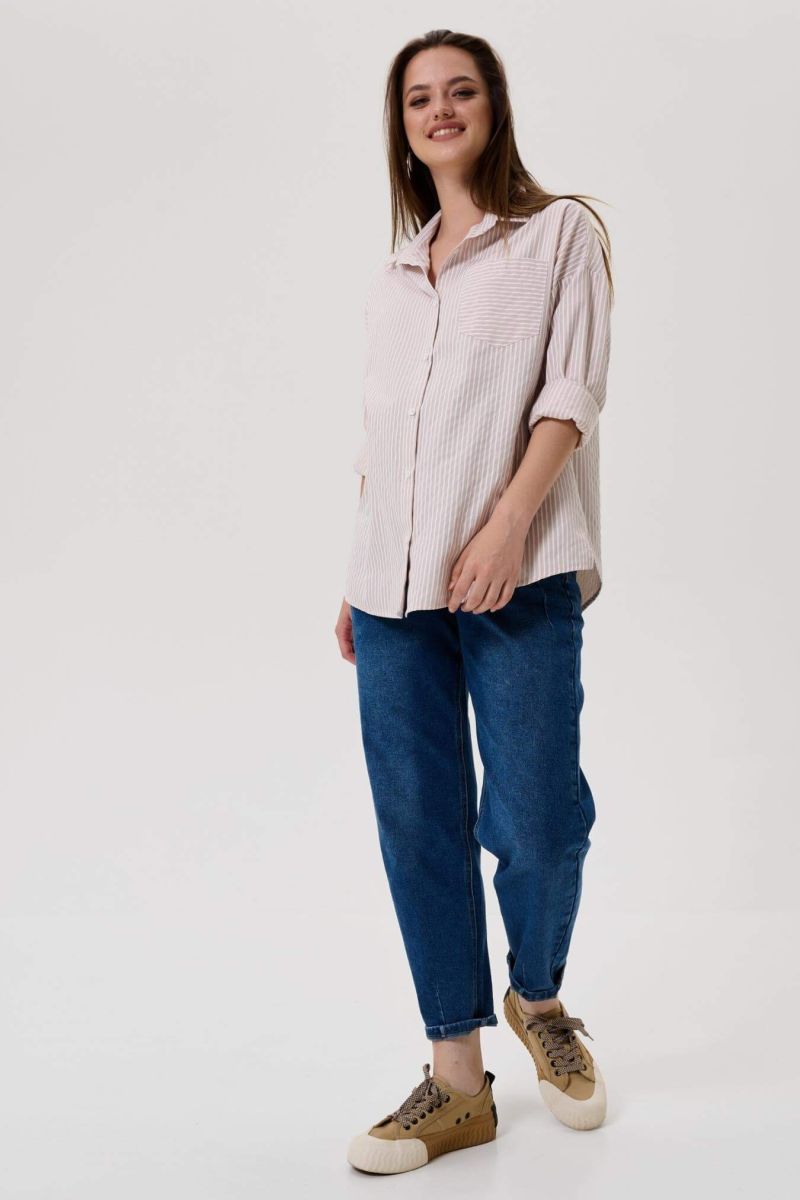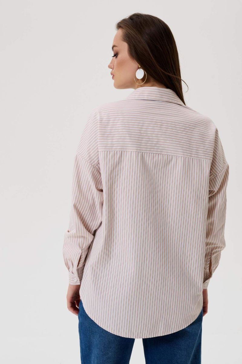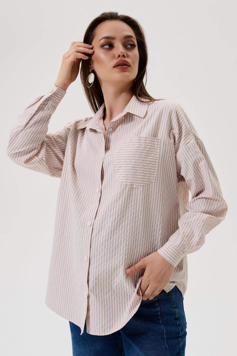 Блузка для беременных женщин бежевого цвета в белую полоску длиной до середины бедра. Рубашечный воротник переходит в застежку-планку на пуговицах.