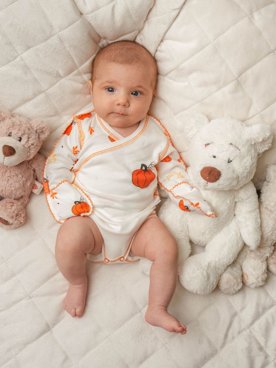 Боди для самых маленьких из приятнейшего интерлока с милым принтом. Обработка "швы наружу"оптимальна для нежной кожи малыша. Ручки при необходимости можно закрыть, чтобы малыш не царапал себя. Модель на запАх, что очень удобно при переодевании.