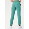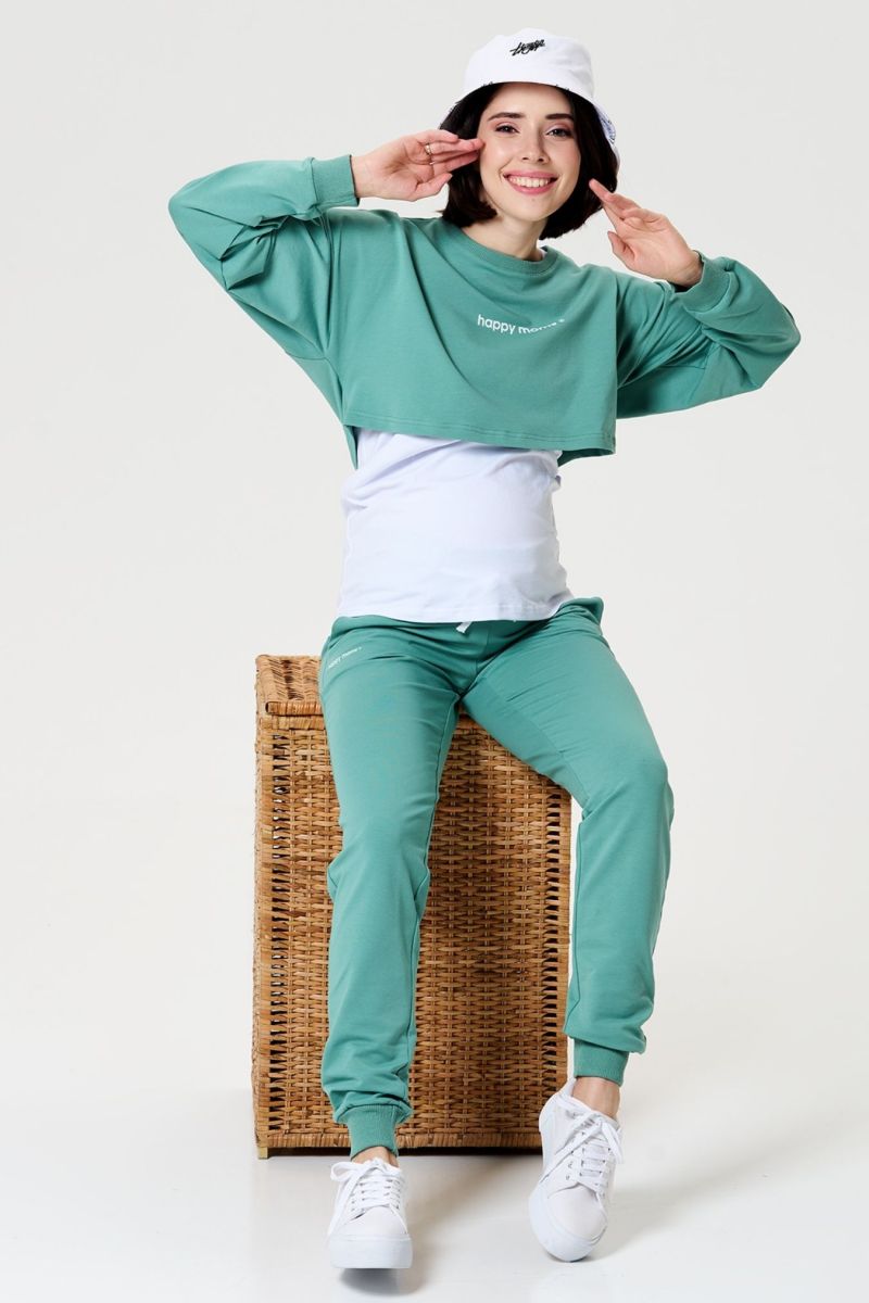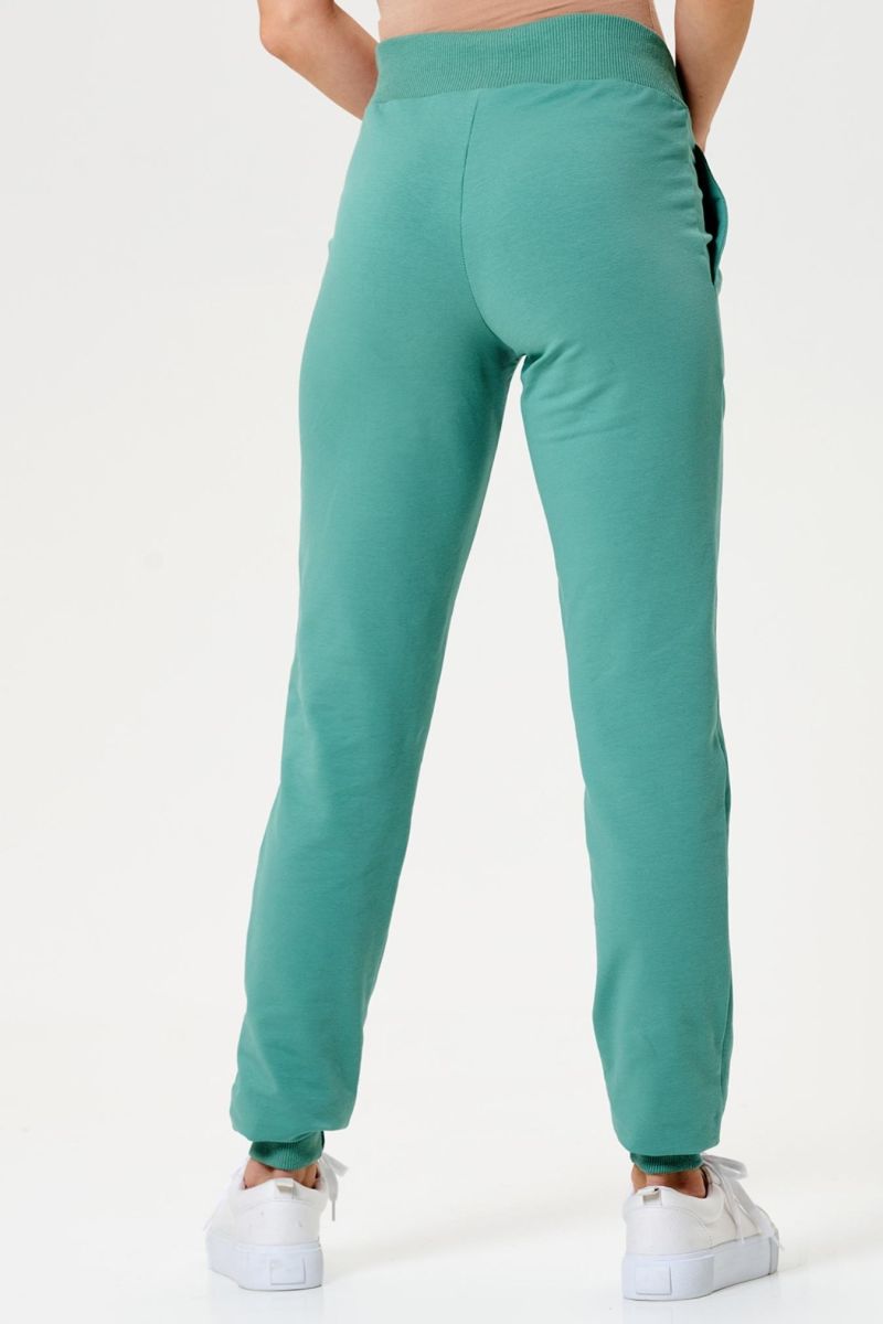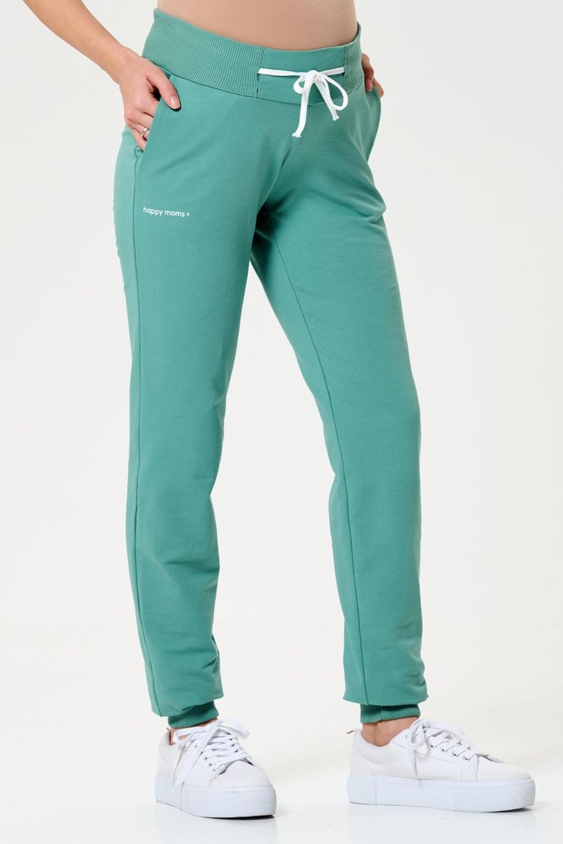 Спортивные брюки для беременных бирюзового цвета с белой кулиской и логотипом бренда из футера. Брюки прямые, манжеты по низу и пояс из трикотажной резинки в тон основной ткани.