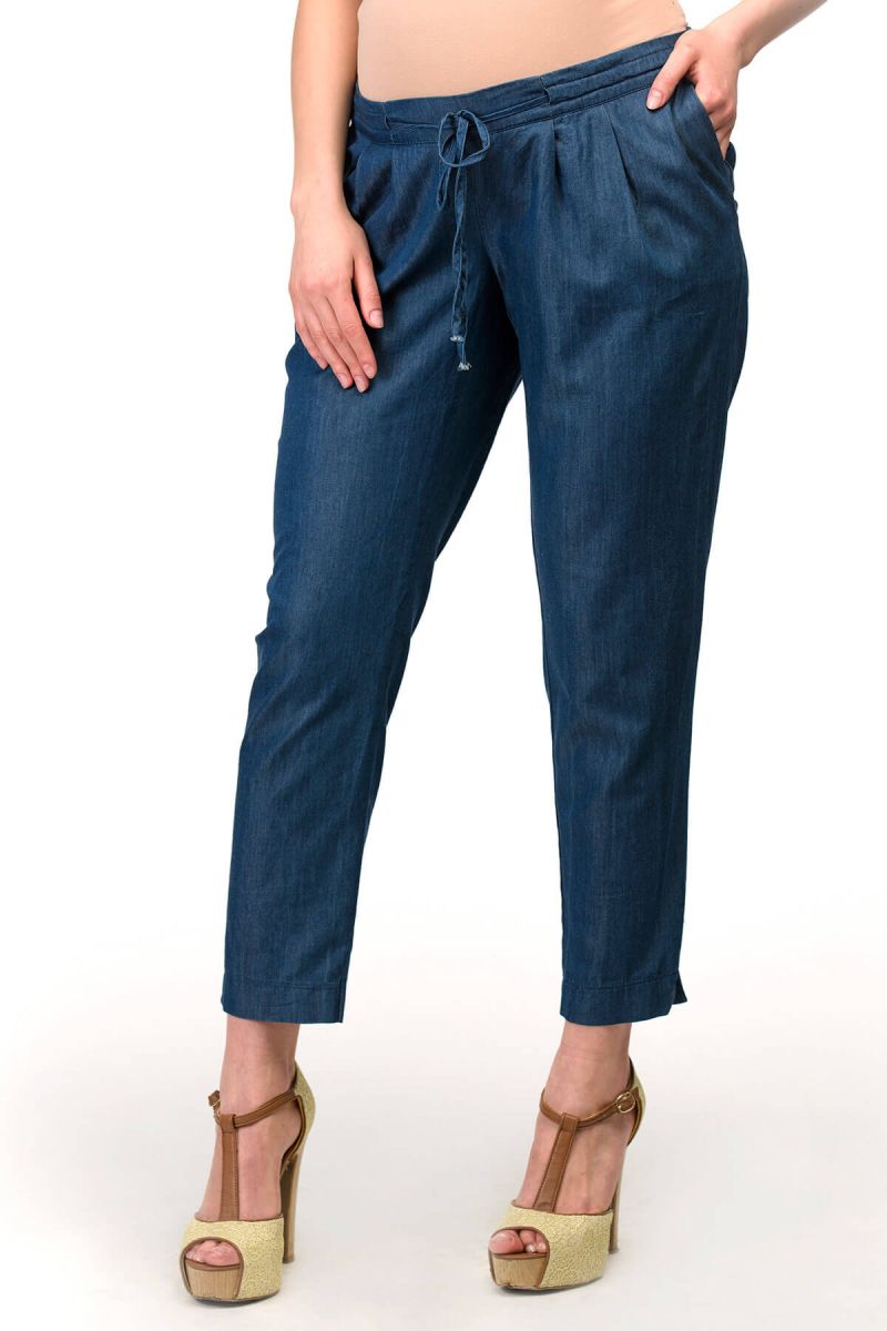 Брюки для беременных женские приглушенного синего цвета прямого силуэта, зауженные к низу. Брюки для беременных летние прекрасно подойдут для теплого сезона. Пояс сзади на резинке, талия корректируется аккуратной кулиской, есть боковые карманы. Складочки спереди дают дополнительный объем для растущего животика. Идеальный базовый вариант под летние блузки и туники, можно сочетать с лаконичными топами и майками. Благодаря крою модель можно носить на всем сроке беременности и после родов.