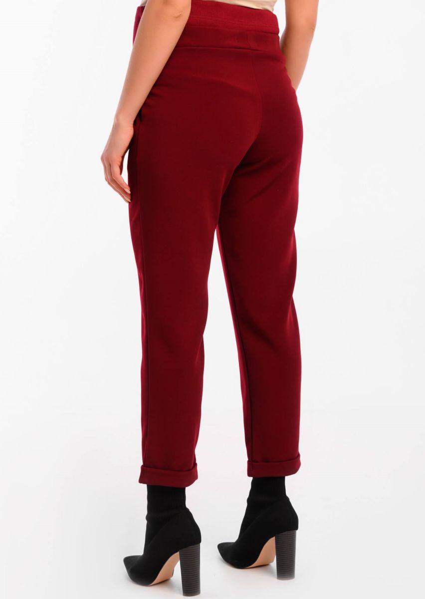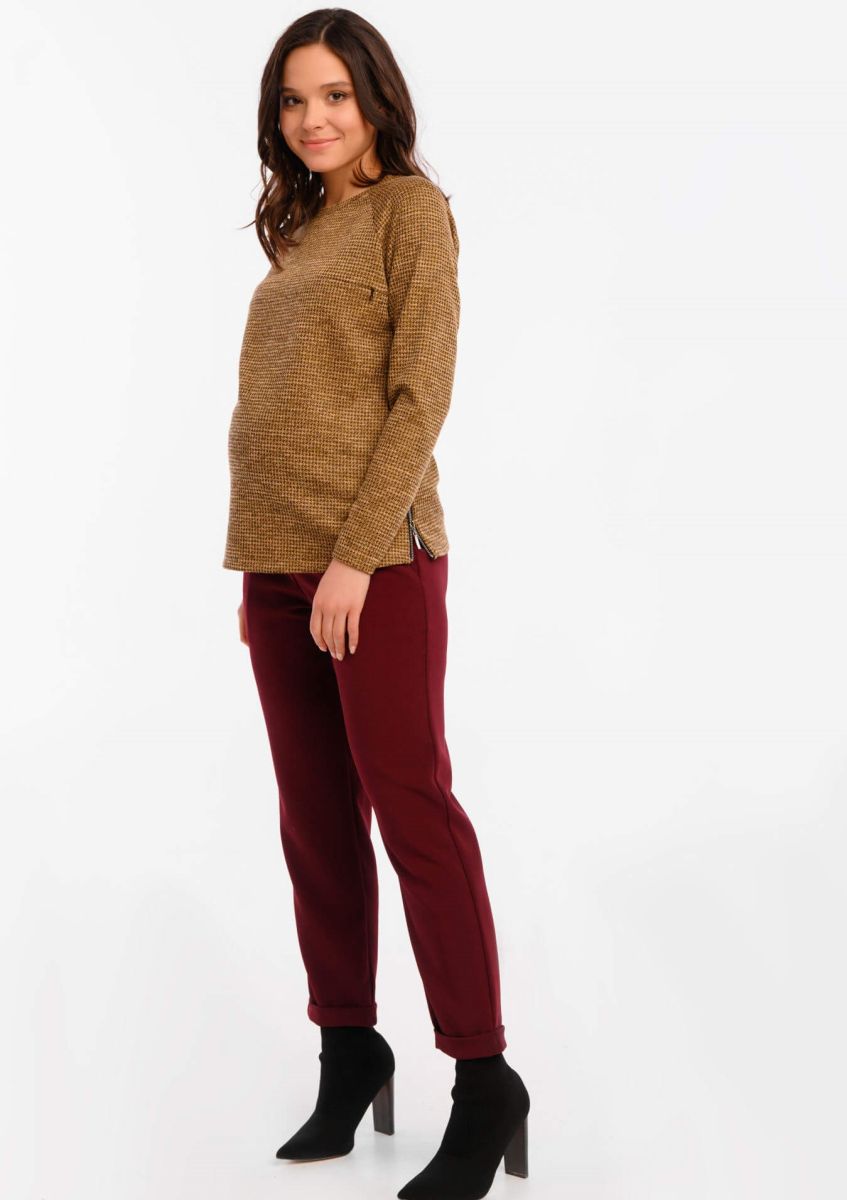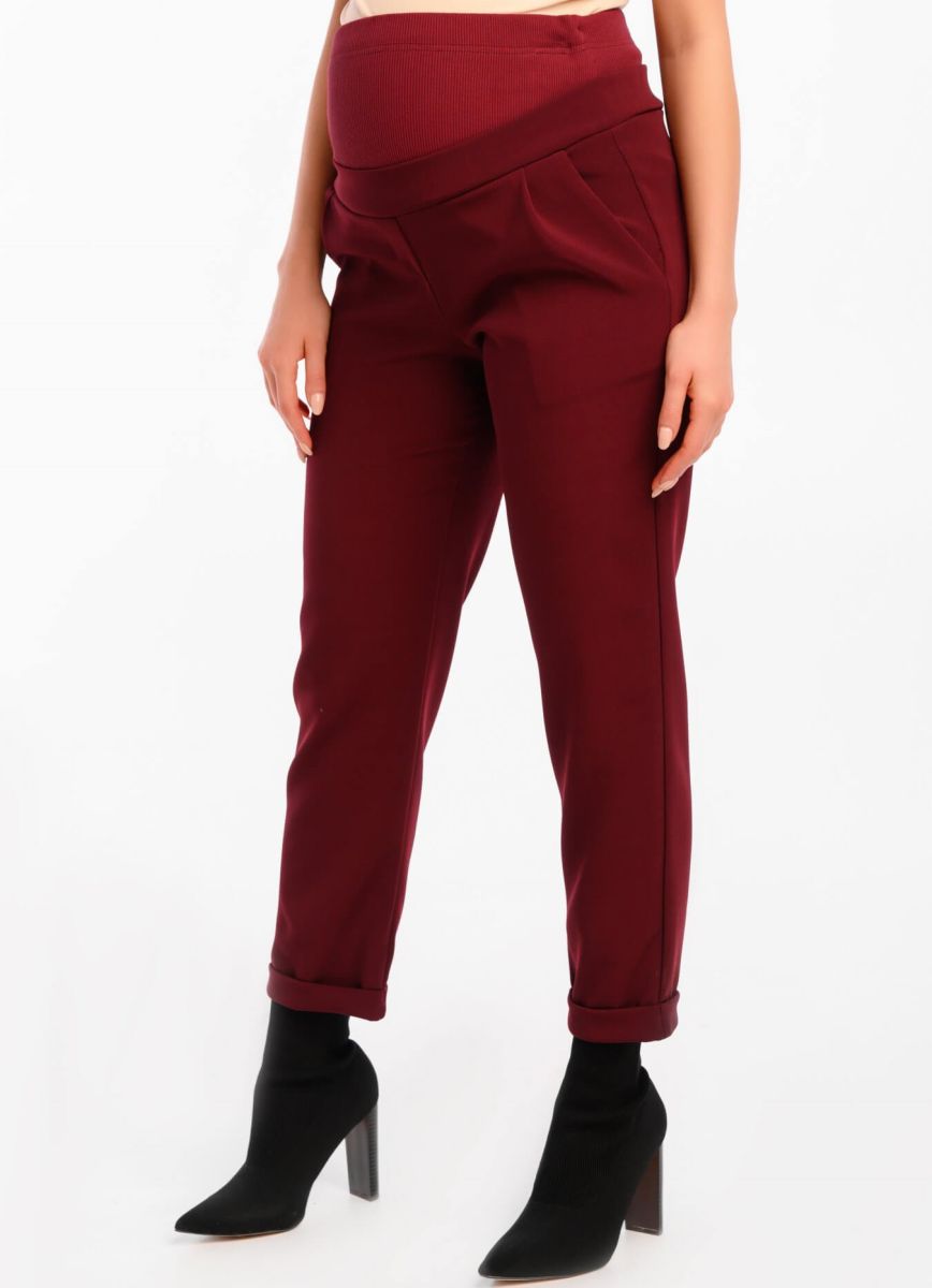 Брюки для беременных женские бордового оттенка прямого силуэта слегка зауженные. Классические брюки для беременных могут стать базовой моделью осенне-зимнего гардероба, сочетаются с блузками и рубашками, элегантными джемперами и полуспортивными свитшотами. Складочки спереди, соединенные с трикотажной вставкой, дают дополнительный объем для растущего животика, есть боковые карманы. Внизу аккуратные отвороты, чуть укороченная длина приоткрывает щиколотки. Благодаря крою модель можно носить на всем сроке беременности.