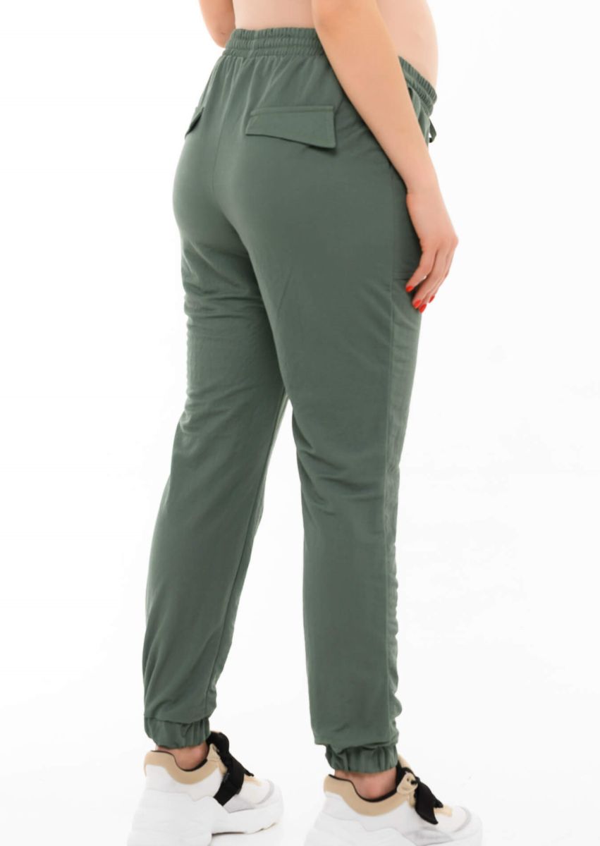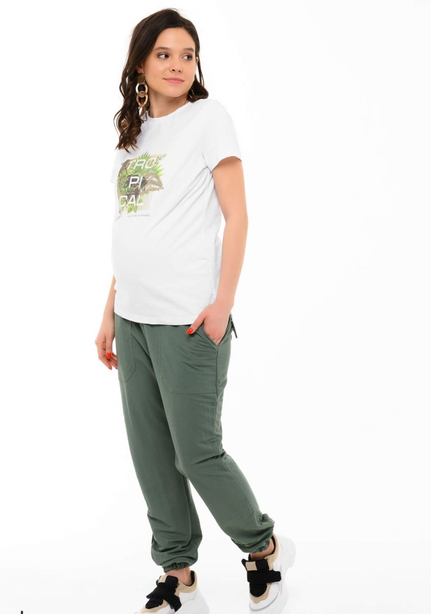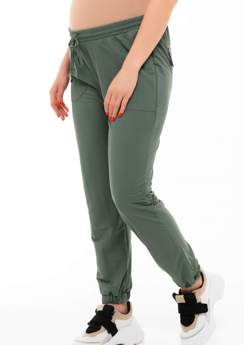 Брюки из трикотажного полотна с мягкой резинкой и кулиской на поясе. Низ брюк также на резинке, есть объемные накладные карманы и декоративные клапаны сзади. Динамичный спортивный фасон брюк поддерживается универсальным оттенком «светлый хаки», модель прекрасно сочетается с полуспортивными майками и кардиганами, кроссовками, слипонами и лаконичными балетками. Ткань «дышит», отводит лишнюю влагу от тела, приятная по ощущениям. Ее сертифицированный состав исключает возникновение раздражения и аллергии, она безопасна для мамы и малыша. Благодаря регулируемому поясу на резинке модель можно носить и после родов.