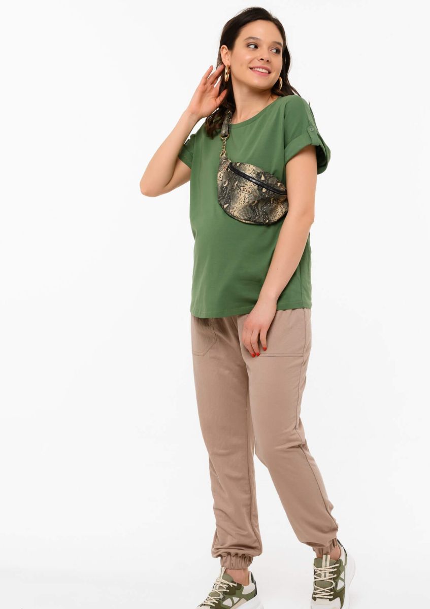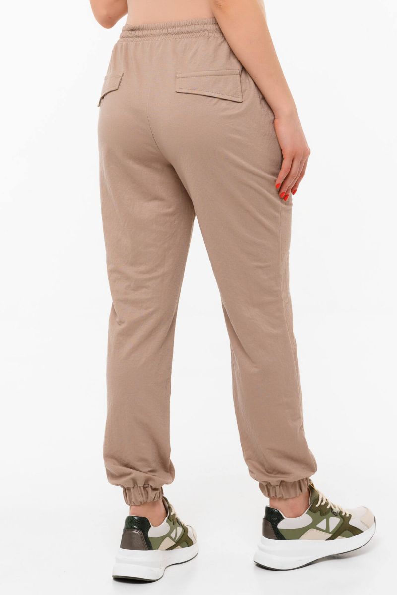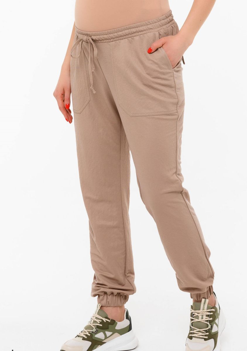 Удобные полуспортивные брюки песочного цвета из трикотажного льна. Модель приятная к телу, дышит, отводит лишнюю влагу – незаменимый летний вариант для современных стильных мам. Внизу брюки на резинках, резинка с кулиской есть и на талии, она помогает регулировать объем брюк. Имеются накладные карманы впереди и декоративные скошенные клапаны сзади, модель сочетается с любыми летними майками и футболками, толстовками и компактными джемперами. Брюки отлично ведут себя в носке, простые в уходе. Ткань прошла сертификацию, она безопасная для мамы, хорошо держит форму, не скатывается, не линяет. Благодаря поясу на резинке брюки можно носить и после рождения малыша.