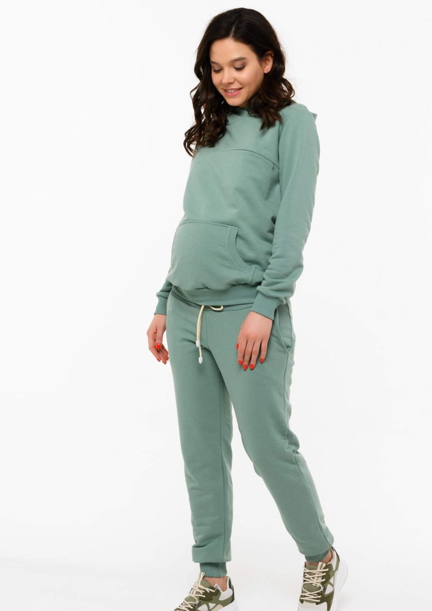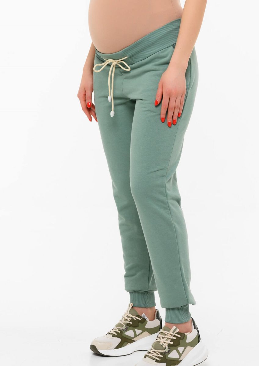 Спортивные брюки для беременных зеленого оттенка с кулиской из мягкого футера. Брюки прямые, манжеты по низу и пояс из трикотажной резинки в тон основной ткани.