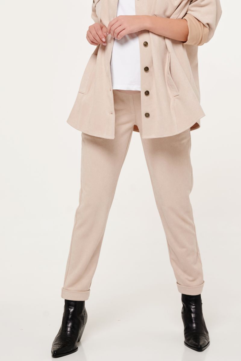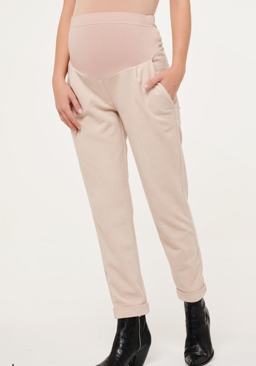 Брюки зауженного силуэта с отворотами. Модный «нюдовый» оттенок придает модели женственности, широкая вставка в районе талии обеспечит комфорт и поддержит растущий животик на всем сроке беременности.