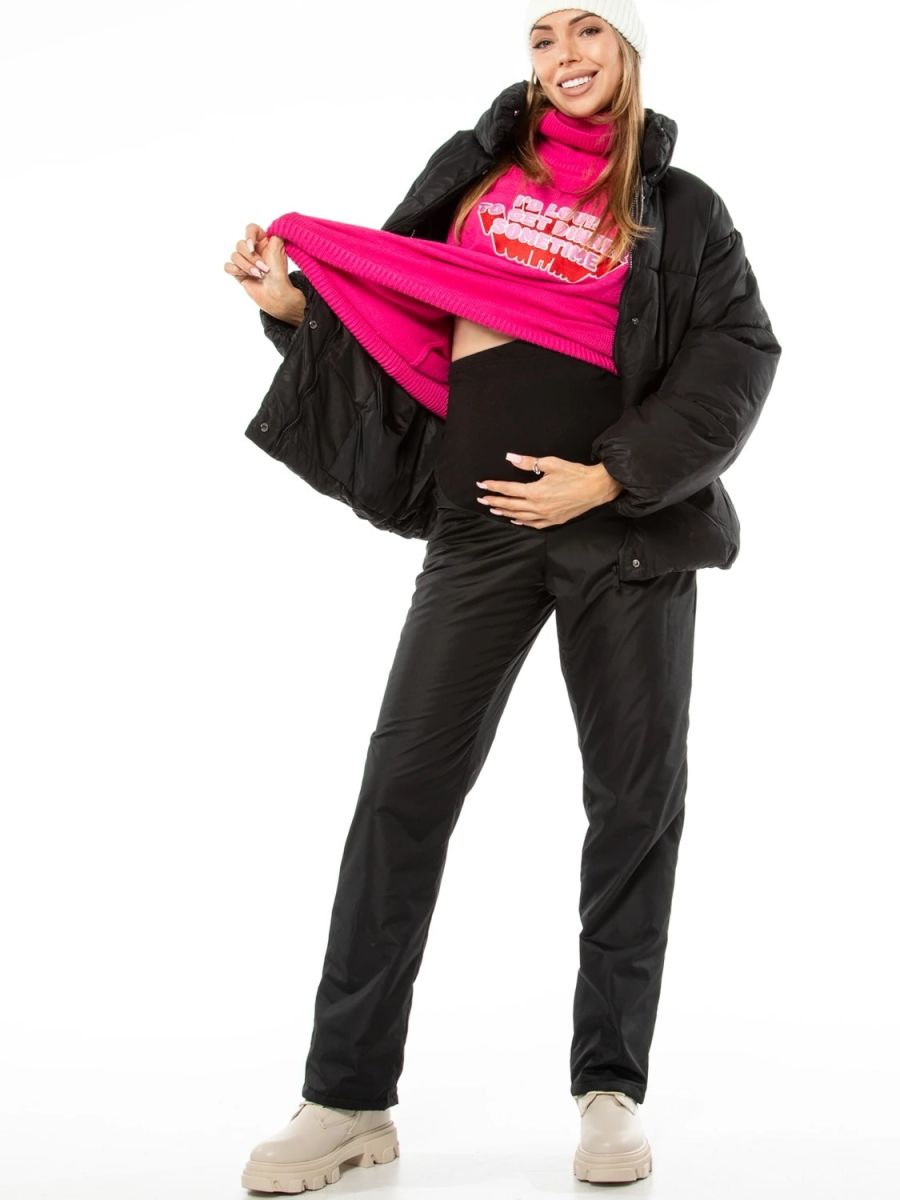 Теплые брюки для беременных. Выполнены из болоневой ткани с подкладкой из флиса. Хорошо держат тепло. Простой классический прямой ситлуэт. Ничего лишнего, главное комфорт и функциональность. На животик есть высокий бандаж и двуслойного трикотажа. Пояс регулируется специальной резинкой.