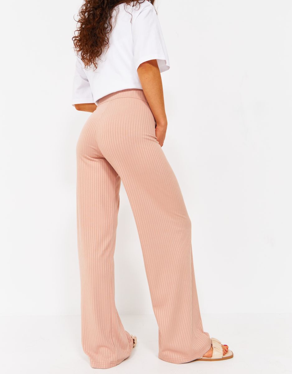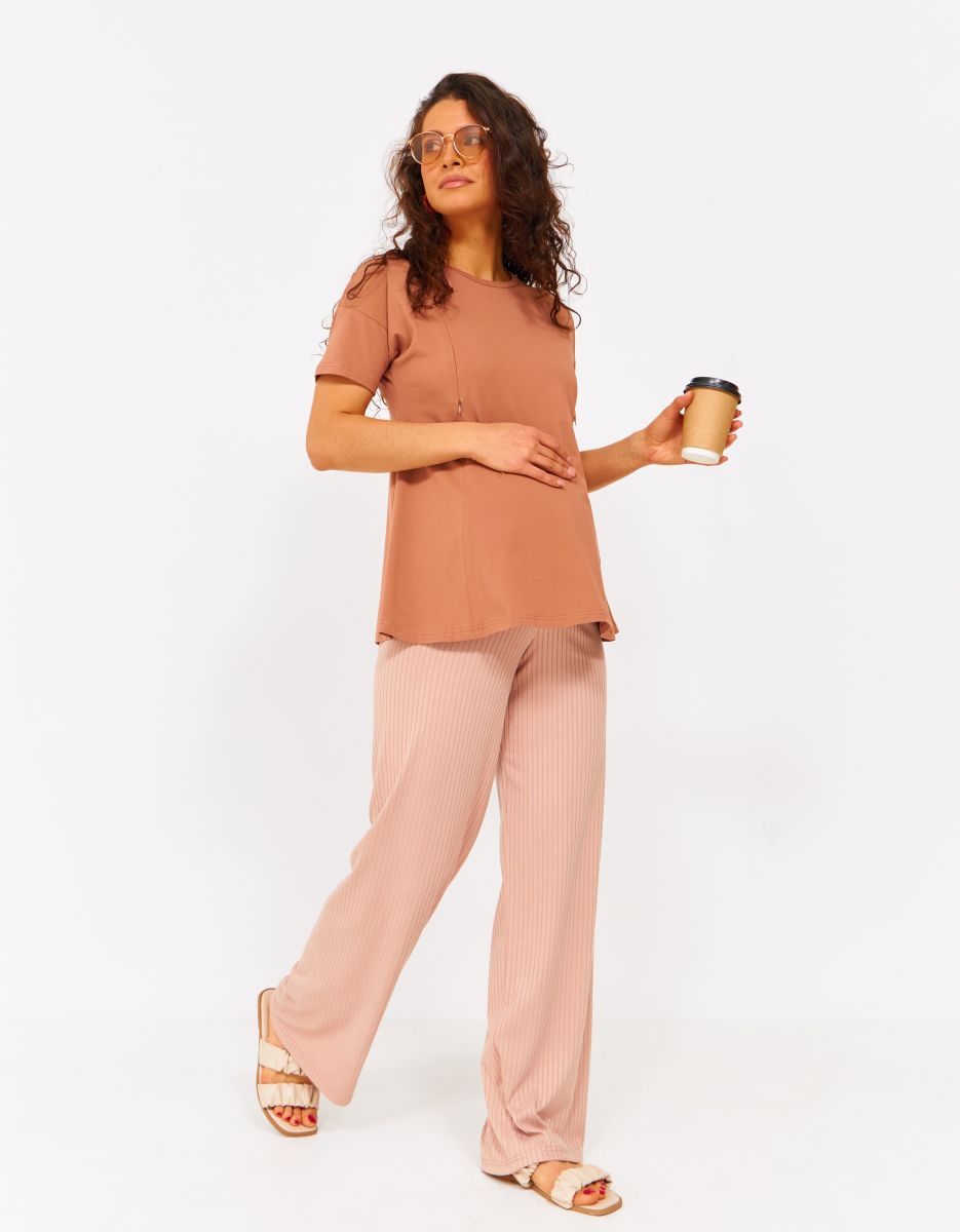 Широкие брюки без бокового шва с высоким круговым бандажом из основной ткани. Выполнены из тонкого, мягкого, эластичного трикотажа-"лапша". Высокий круговой бандаж из основной ткани регулируется пуговкой по верху.