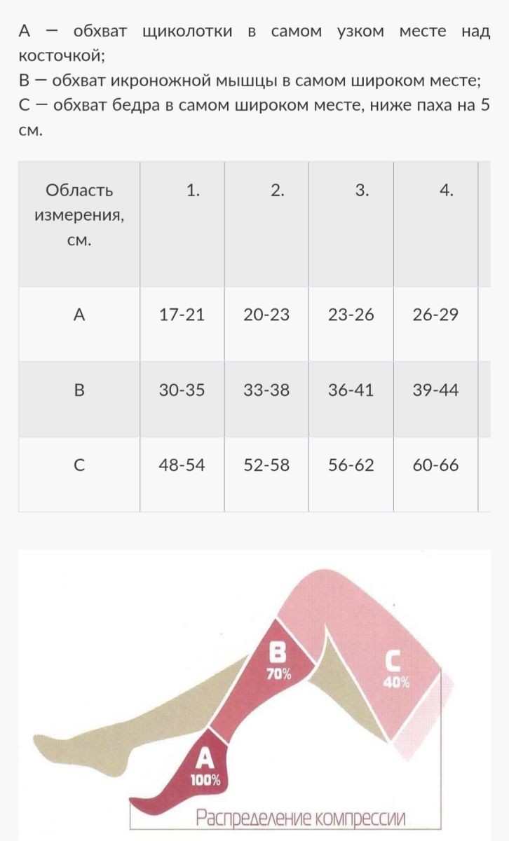 ВАЖНО! Измерение участков нужно проводить утром до появления отёчности на ногах. Размер изделия подбирать по таблице подбора и согласно конструктивным особенностям конечности, так как изделия разработаны на длину ноги от 65 до 74 см. Компрессия на ноге распределена градуировано, максимальное давление в области щиколотки, минимальное в области бедра.