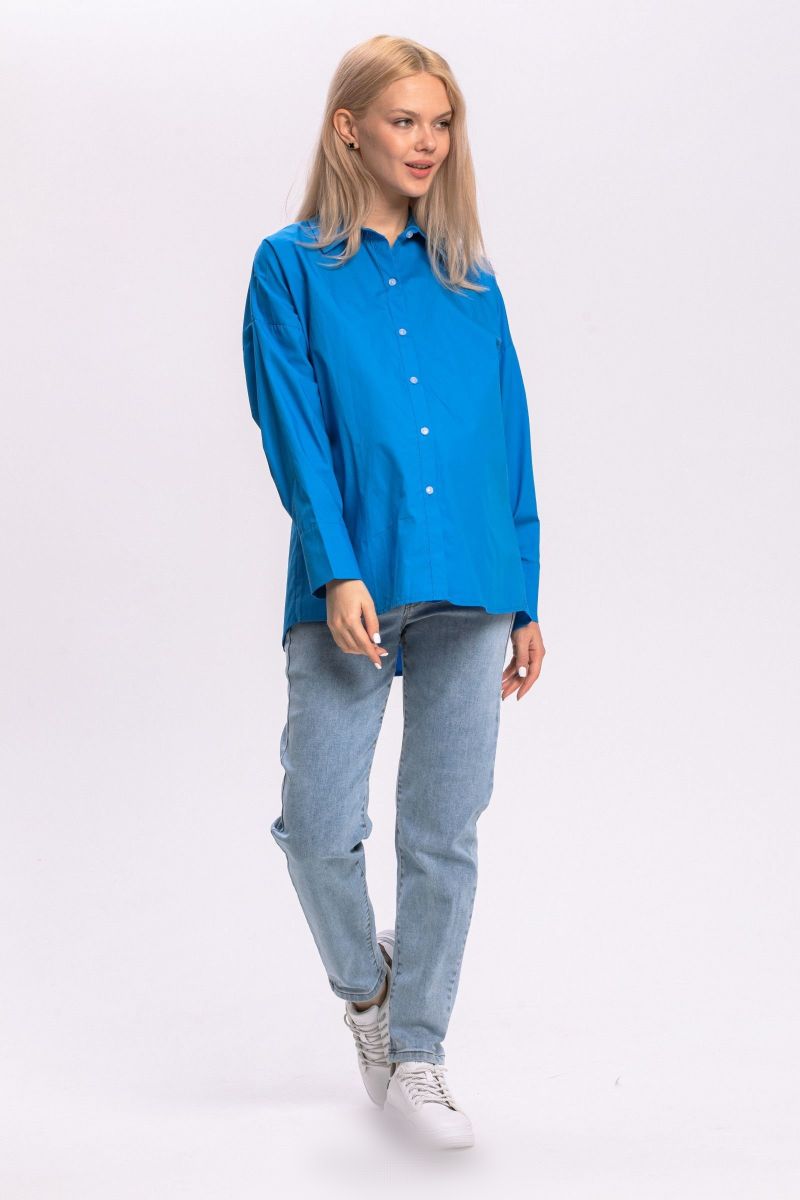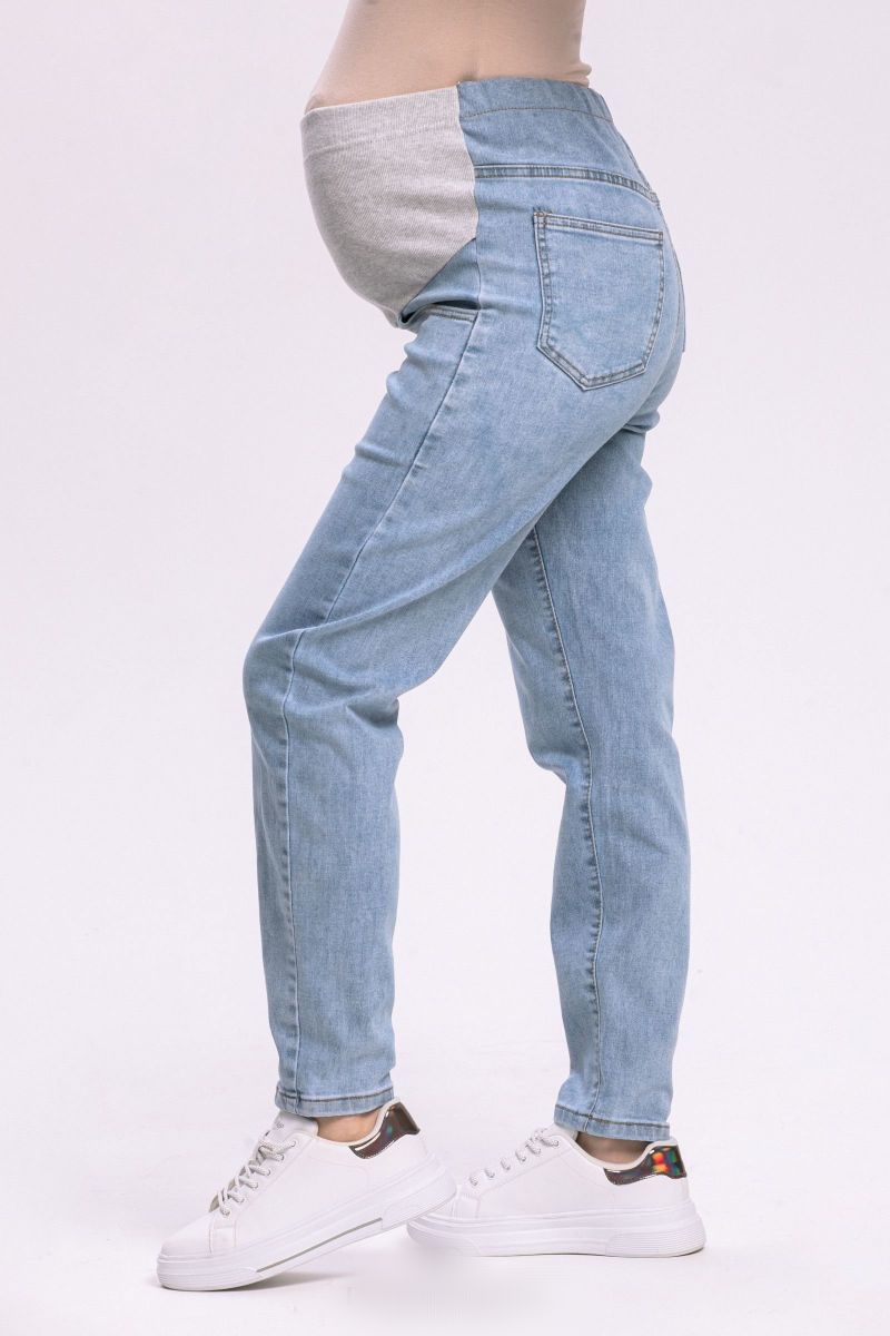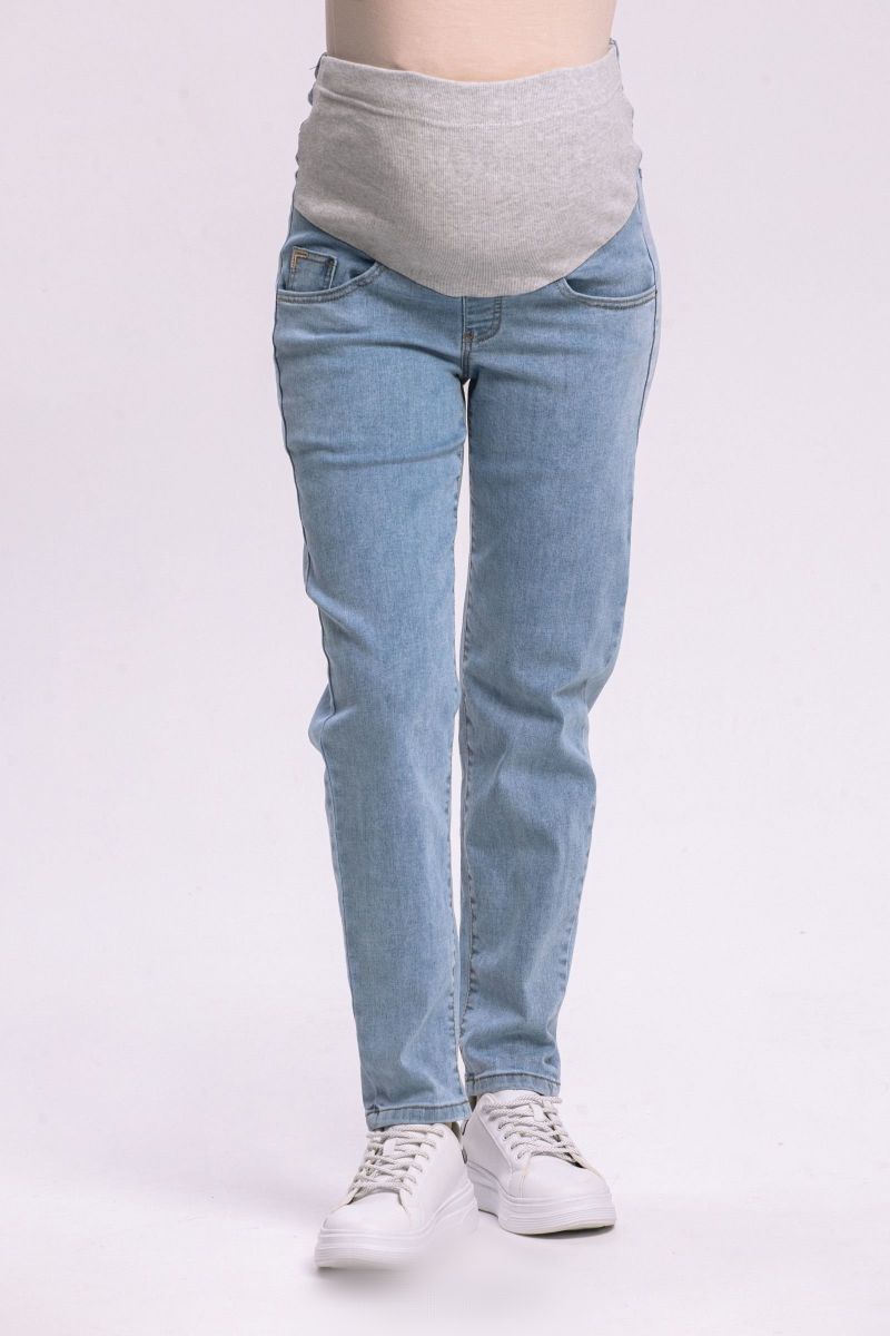 Джинсы для беременных. Выполнены из мягкой, облегчённой, очень эластичной джинсы средней плотности. Сзади по спинке резинка, обеспечивающая плотное прилегание к пояснице. Высокий трикотажный бандаж на передней части регулируется пуговкой по верху.