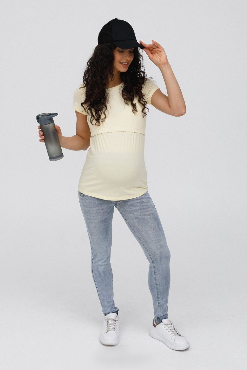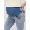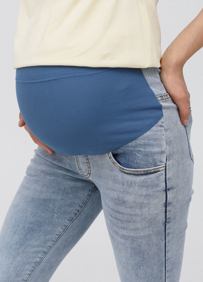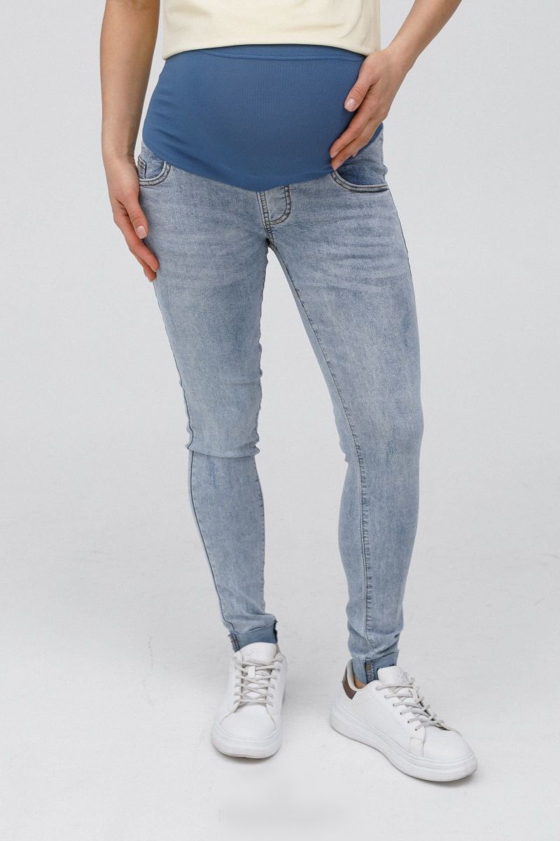 Джинсы для беременных зауженного силуэта с очень лёгкими декоративными потёртосями на передней части и декоративным отворотом с необработанным нижним краем, что позволяет регуливать длину по росту. Выполнены из облегченной, мягкой, очень эластичной джинсы на весенний сезон. Высокий трикотажный бандаж на передней части регулируется пуговкой по верху.