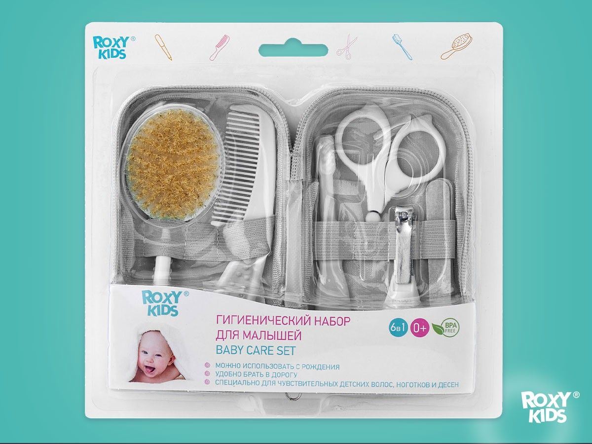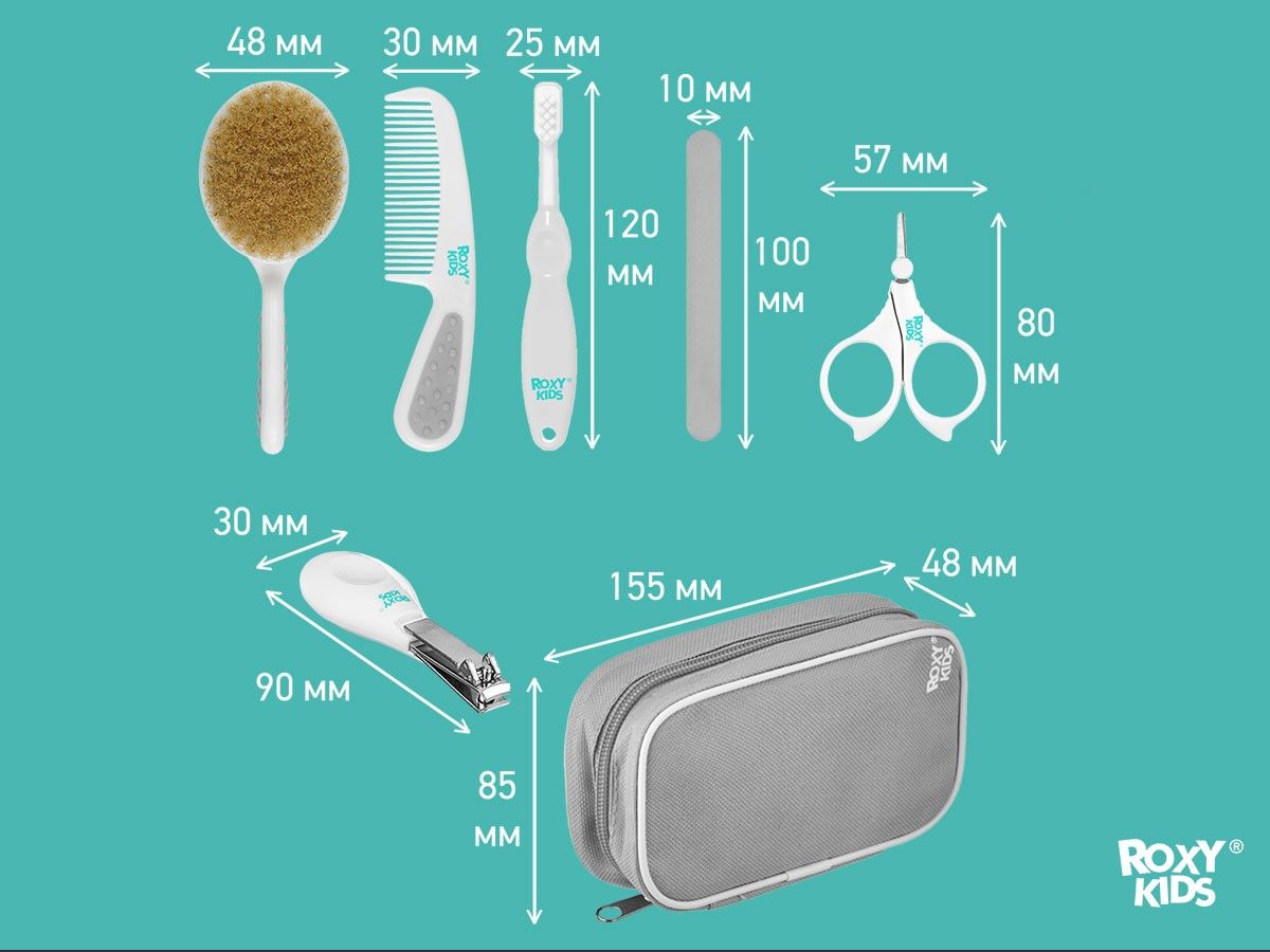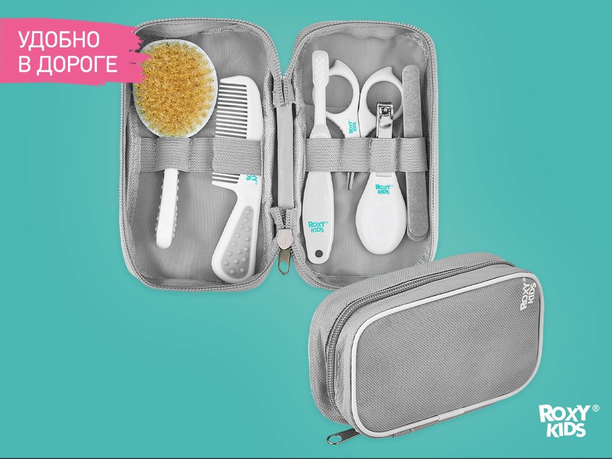 Набор для ухода за новорожденным от ROXY-KIDS за грудничком с первых дней жизни. Его можно компактно хранить в футляре и брать куда угодно. В наборе есть щетка для волос с натуральной щетиной, расческа, маникюрные ножницы, щипчики для ногтей, 4 пилочки, зубная щетка. Массажная щетка подходит для вычесывания себорейных чешуек из волос младенца. Она улучшает кровообращение кожи головы и стимулирует волосяные луковицы, ускоряя рост первых волос малыша. Расческа с закругленными зубцами не царапает нежную кожу головы и обеспечит массажный эффект. Ножницы с закругленными тонкими лезвиями, щипчики из нержавеющей стали и пилочки безопасны и сделаны специально для мягких и маленьких ноготков новорожденных. Подстригайте ноготки, когда они отрастают на 1 мм, иначе малыш может себя поцарапать. Миниатюрная зубная щетка из деликатного нейлона поможет ухаживать за самыми первыми зубами и снять зуд при прорезывании.