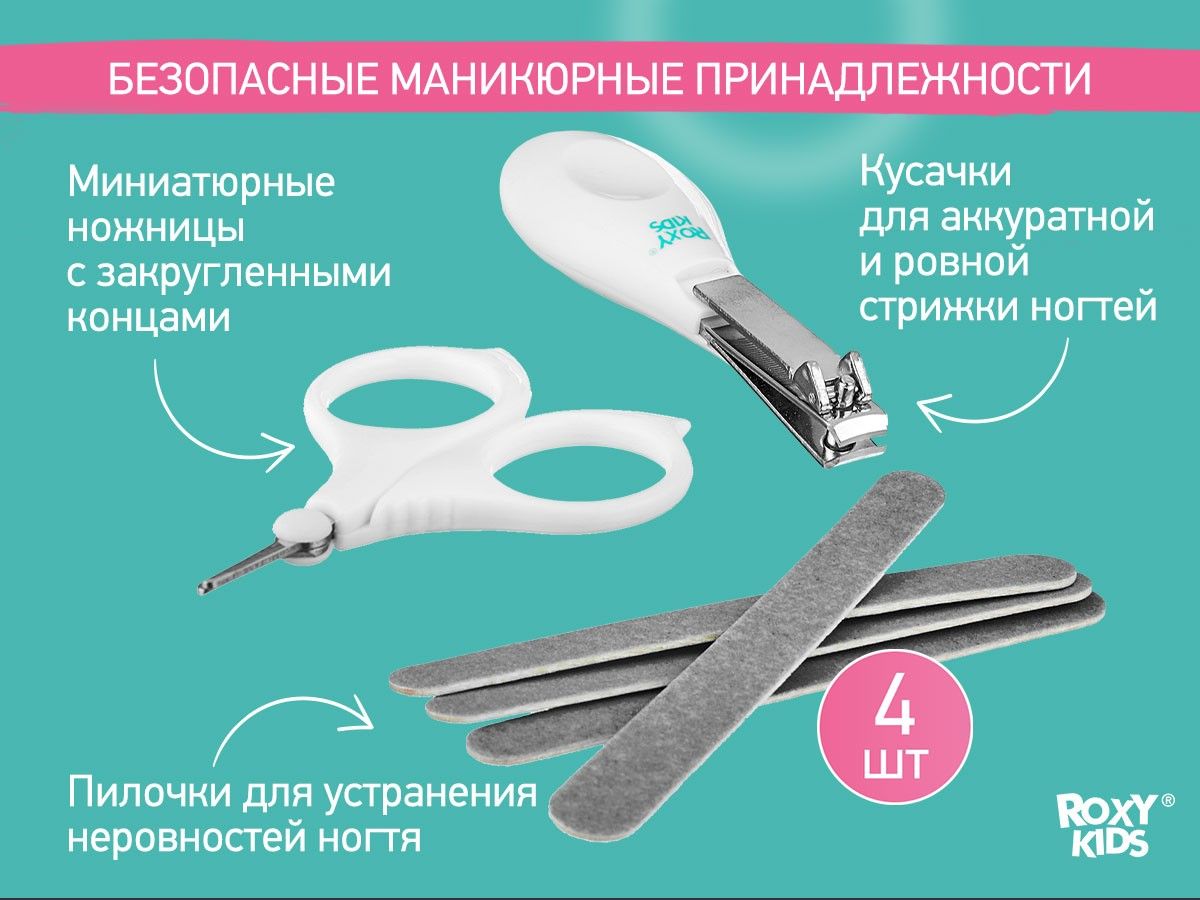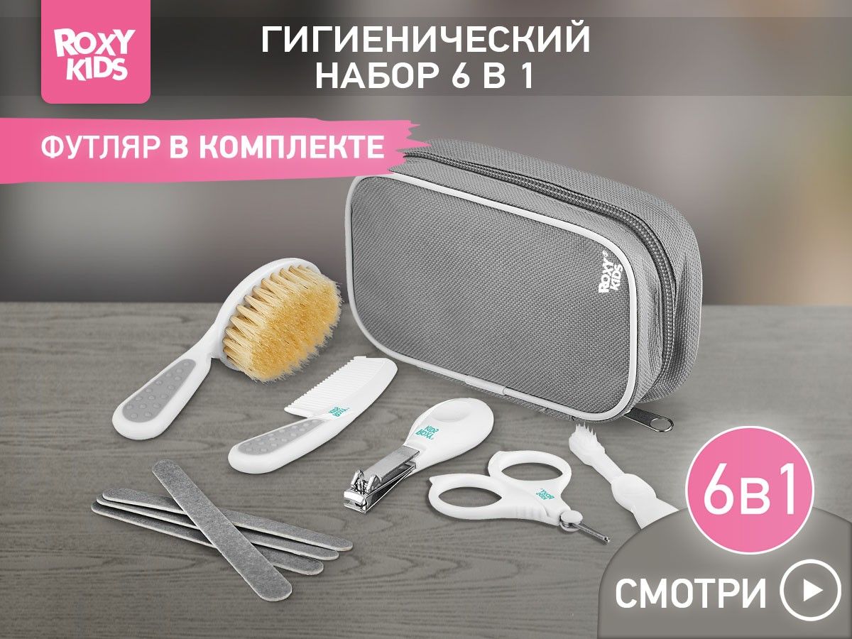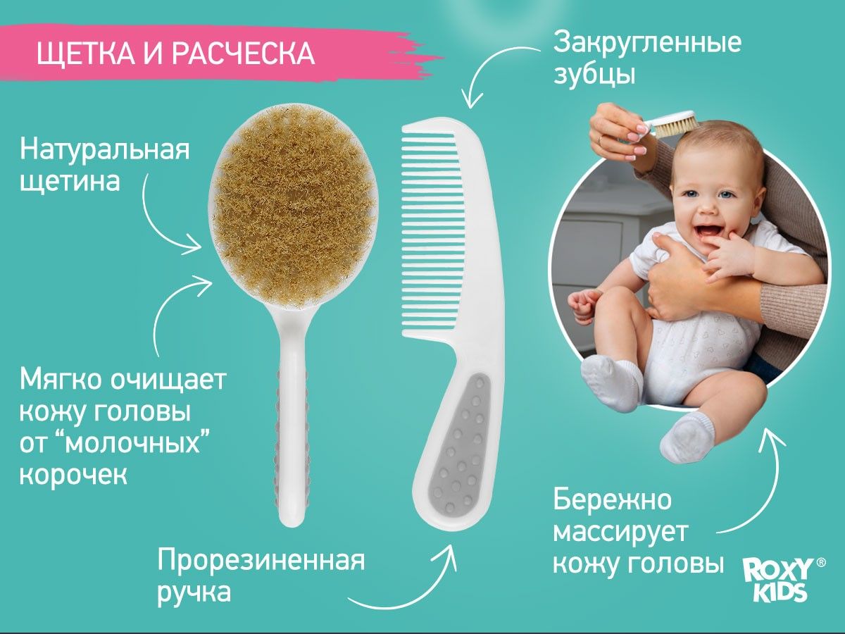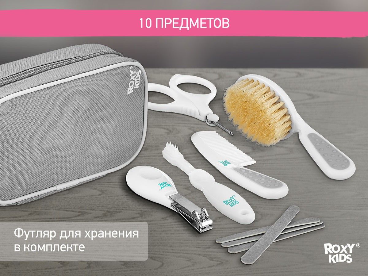 Набор для ухода за новорожденным от ROXY-KIDS за грудничком с первых дней жизни. Его можно компактно хранить в футляре и брать куда угодно. В наборе есть щетка для волос с натуральной щетиной, расческа, маникюрные ножницы, щипчики для ногтей, 4 пилочки, зубная щетка. Массажная щетка подходит для вычесывания себорейных чешуек из волос младенца. Она улучшает кровообращение кожи головы и стимулирует волосяные луковицы, ускоряя рост первых волос малыша. Расческа с закругленными зубцами не царапает нежную кожу головы и обеспечит массажный эффект. Ножницы с закругленными тонкими лезвиями, щипчики из нержавеющей стали и пилочки безопасны и сделаны специально для мягких и маленьких ноготков новорожденных. Подстригайте ноготки, когда они отрастают на 1 мм, иначе малыш может себя поцарапать. Миниатюрная зубная щетка из деликатного нейлона поможет ухаживать за самыми первыми зубами и снять зуд при прорезывании.