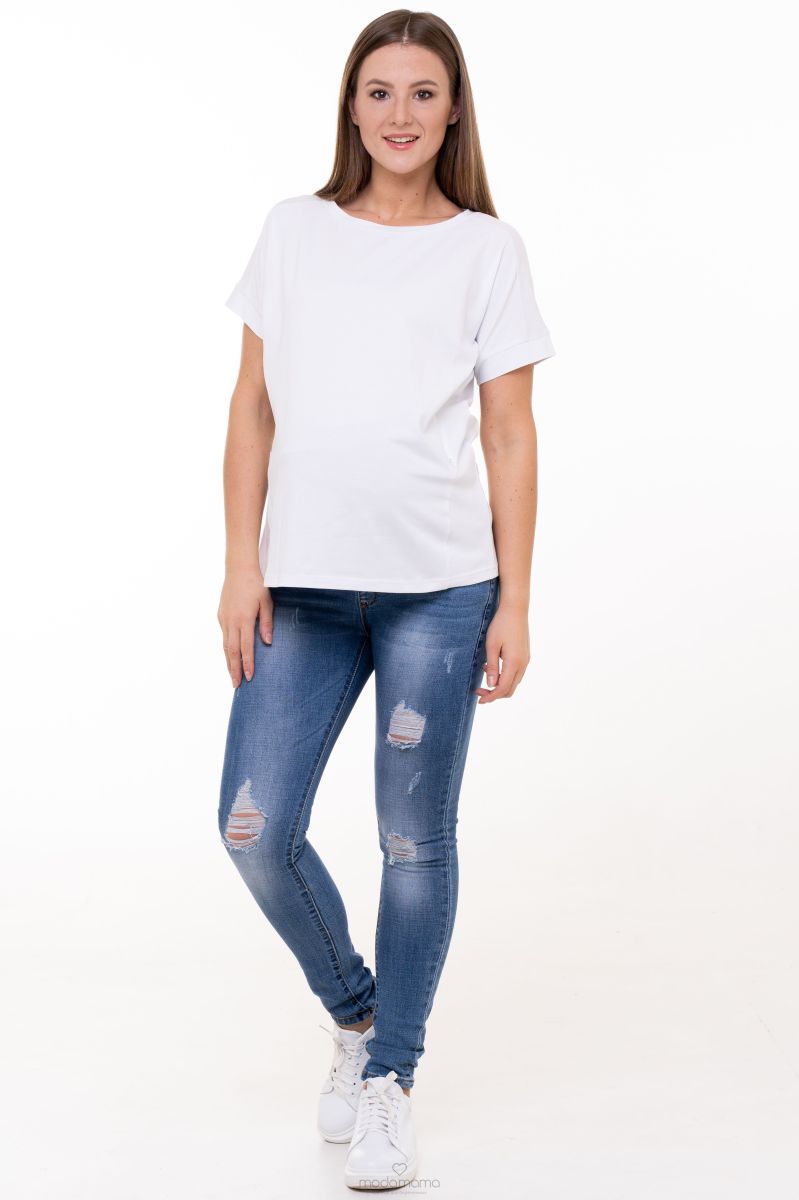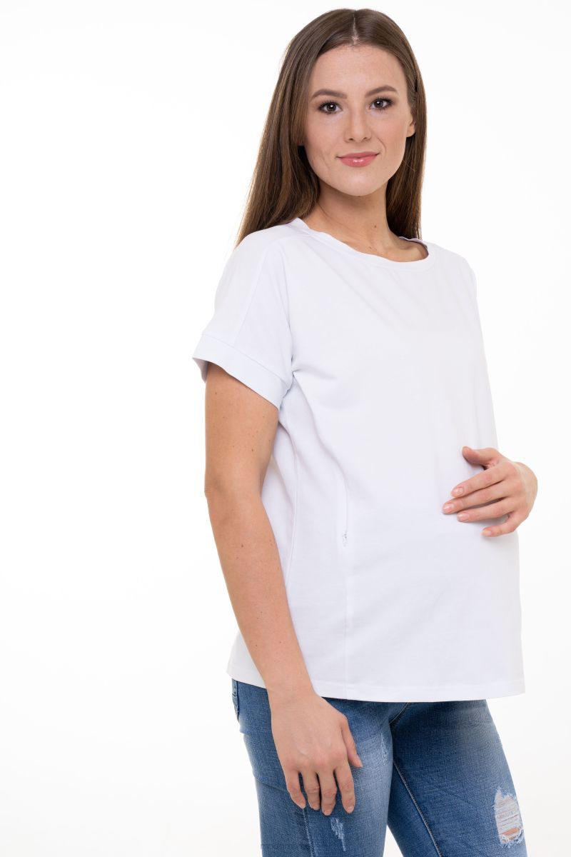 Футболка для беременных и кормящих мам свободного кроя с коротким цельнокроенным рукавом со спущенным плечом. Выполнена из тонкого трикотажа с добавлением эластана. Секрет для кормления - вертикальные замки-"молнии" в рельефах на груди.