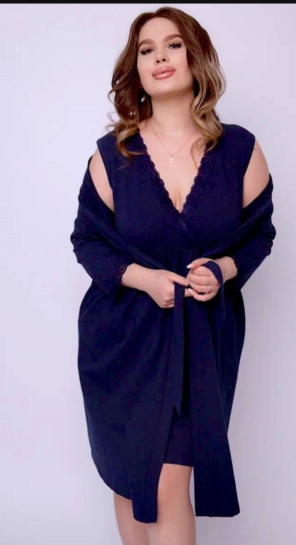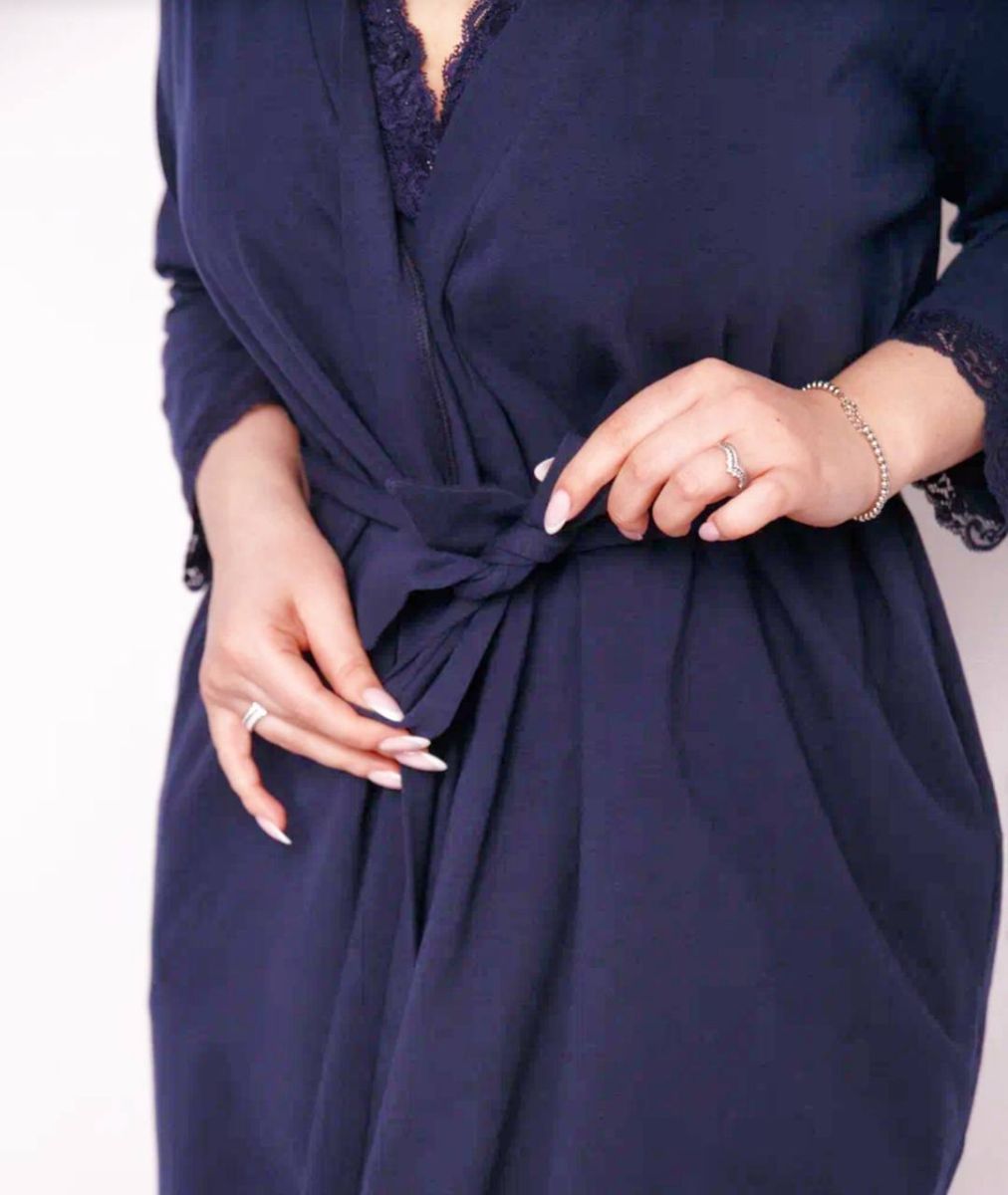 Халат из мягкого трикотажного хлопкового полотна с отделкой кружевом в тон для будущих и кормящих мам. Модель на запах, в которой широкий пояс поможет регулировать объем изделия. Рукав 3/4 с кружевом.