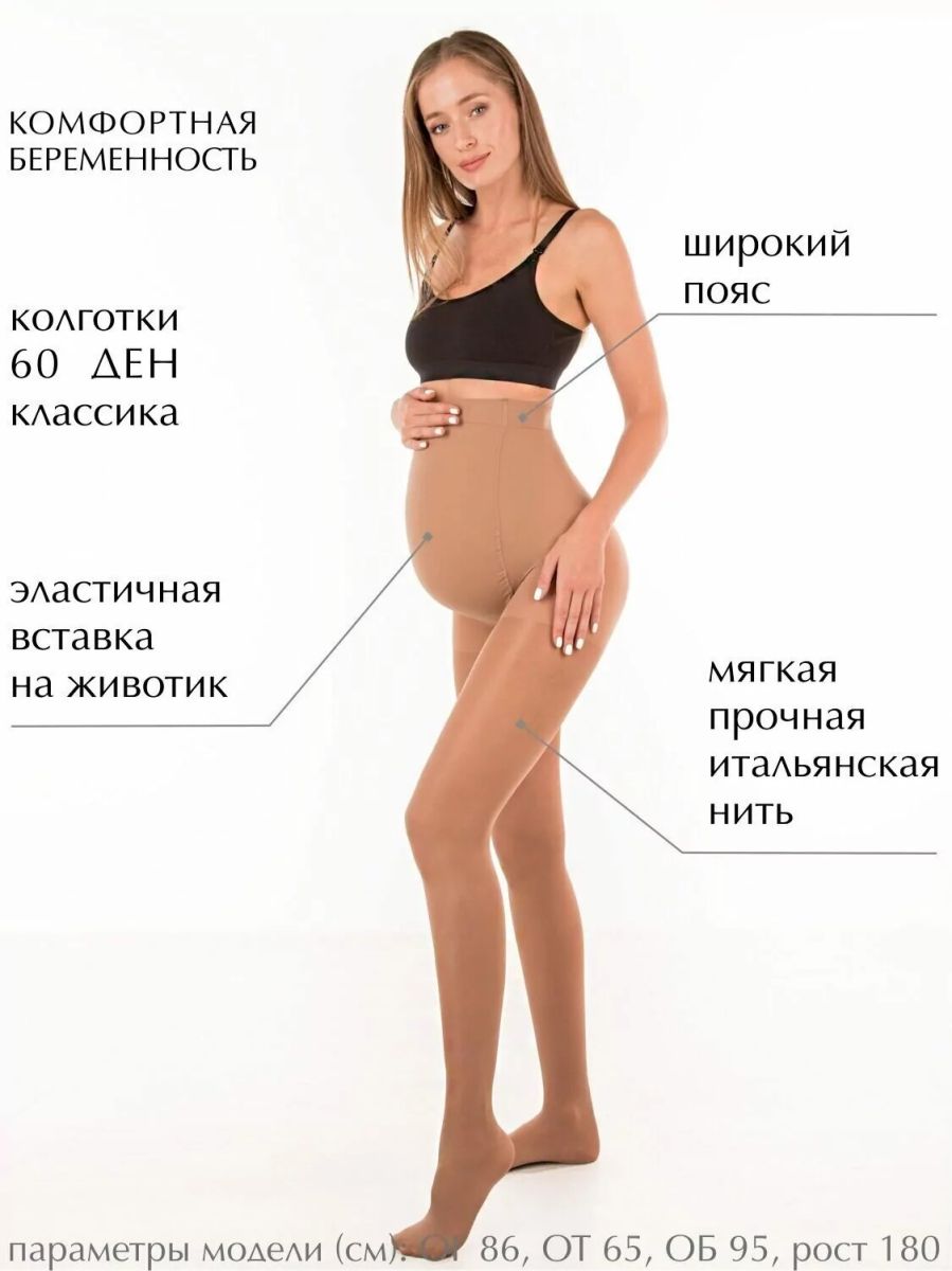 Колготки для беременных 60DEN.. Великолепно подчеркнут длину и стройность ног. Прекрасно сочетаются с любым нарядом. Специальная анатомическая вставка в области живота обеспечивает женщине максимальный комфорт и исключает эффект давления. Изготовлены из высококачественного экологически чистого сырья на современном итальянском оборудовании. Вид переплетения, используемый в области торса, устойчив к повреждениям.