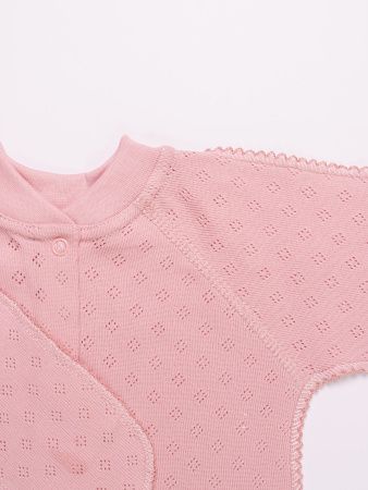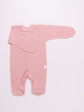 Комбинезон для новорожденных изготовлен из нежного ажурного трикотажа. 100% хлопок с ажурным узором, материал тонкий, легкий. Ткань не линяет, практически не мнется, не выцветает и прекрасно держит форму после стирки. Изделие выполнено швами наружу, чтобы малышу было особенно комфортно. На комбинезоне по всей длине, а также по длине ног, расположены кнопки, что облегчает процесс переодевания.