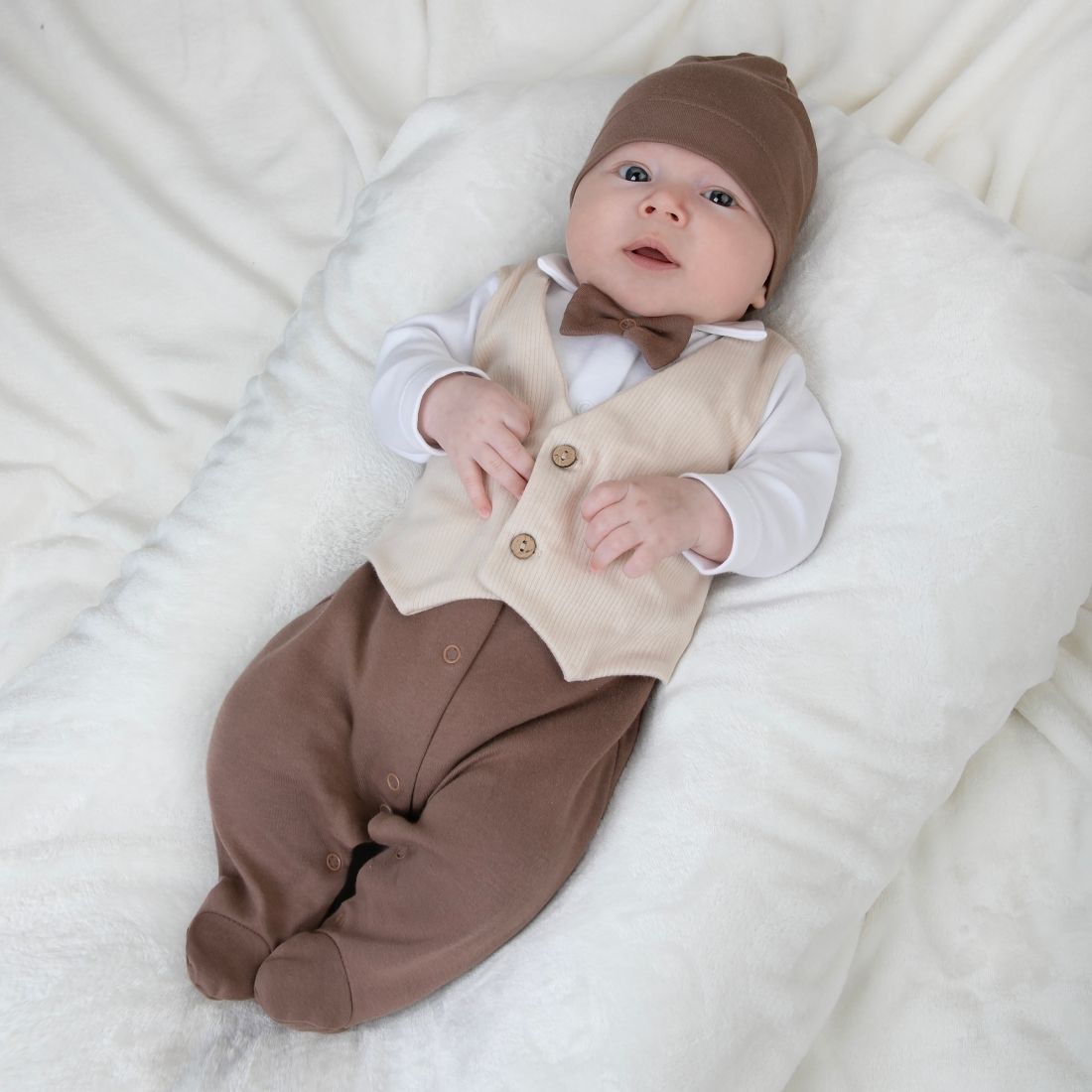 Комплект для юного джентльмена из легкого однослойного комбинезона слипа и шапочки к нему.