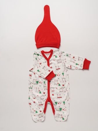 Яркий новогодний комплект для самых маленьких состоит из слипа и шапочки (хлопок 100%). Отличный наряд для новогодней фотосессии и для встречи Первого в жизни Нового года.