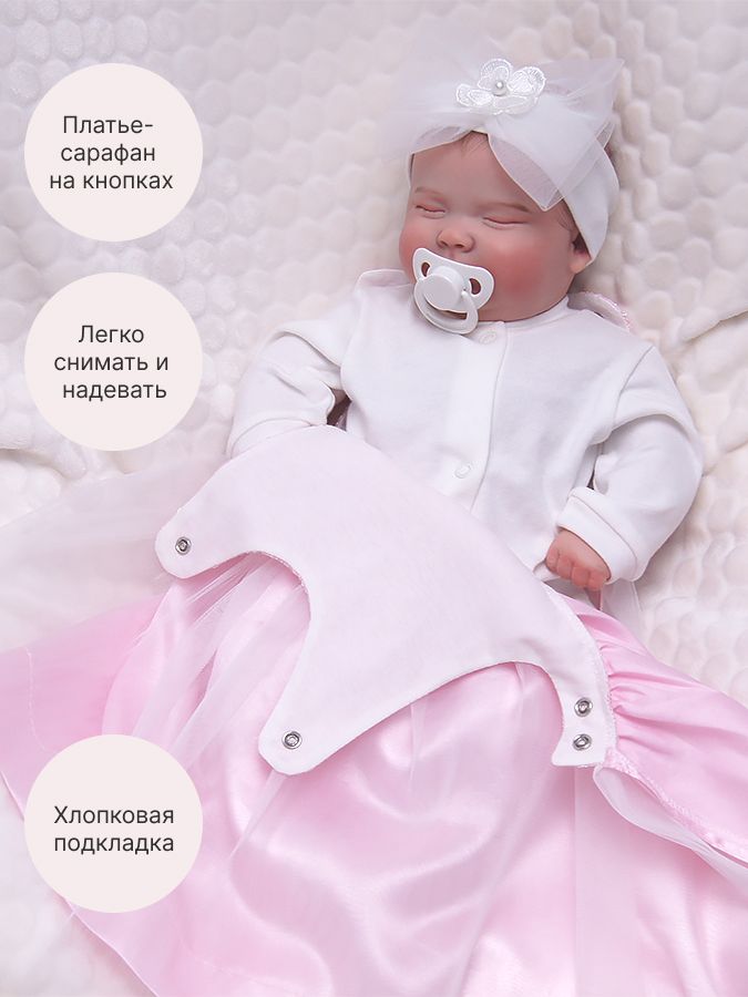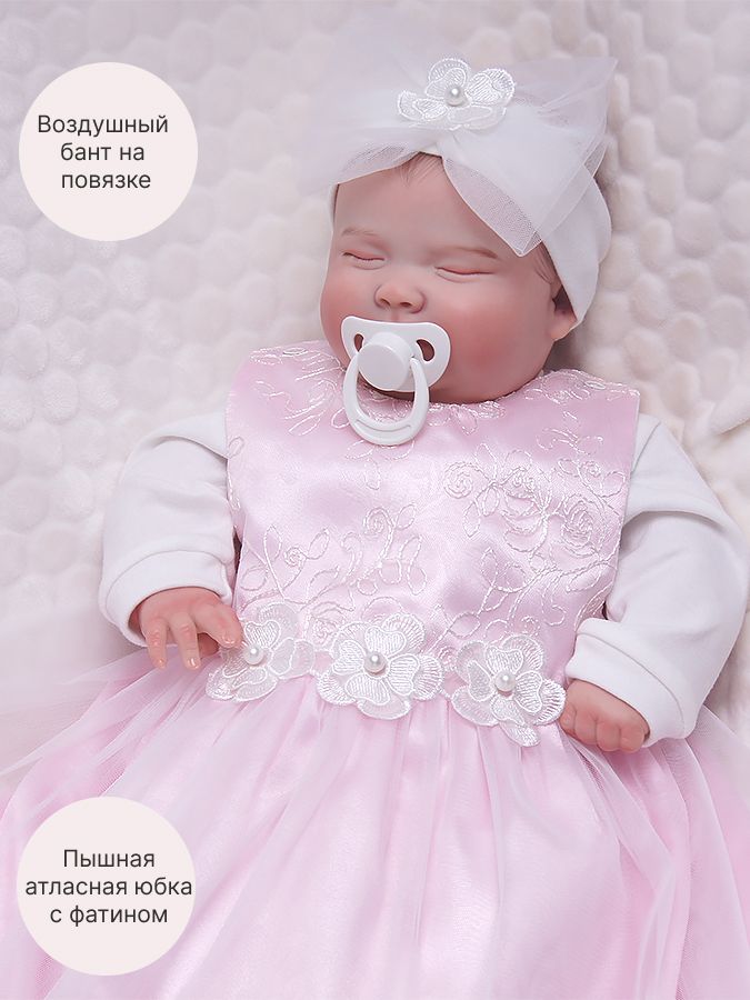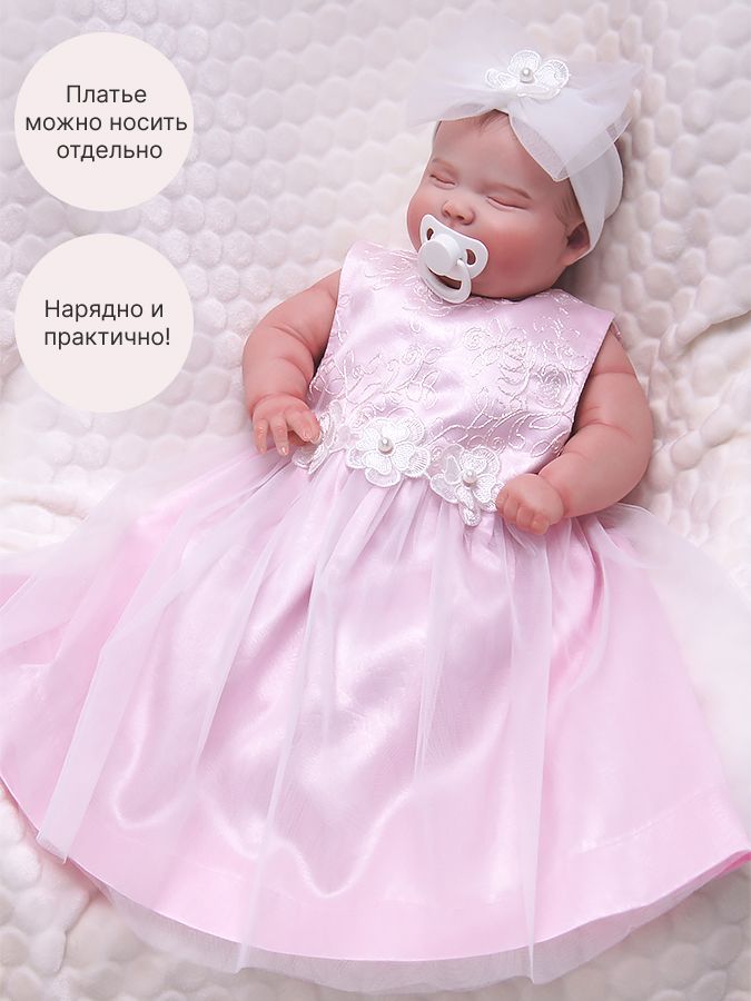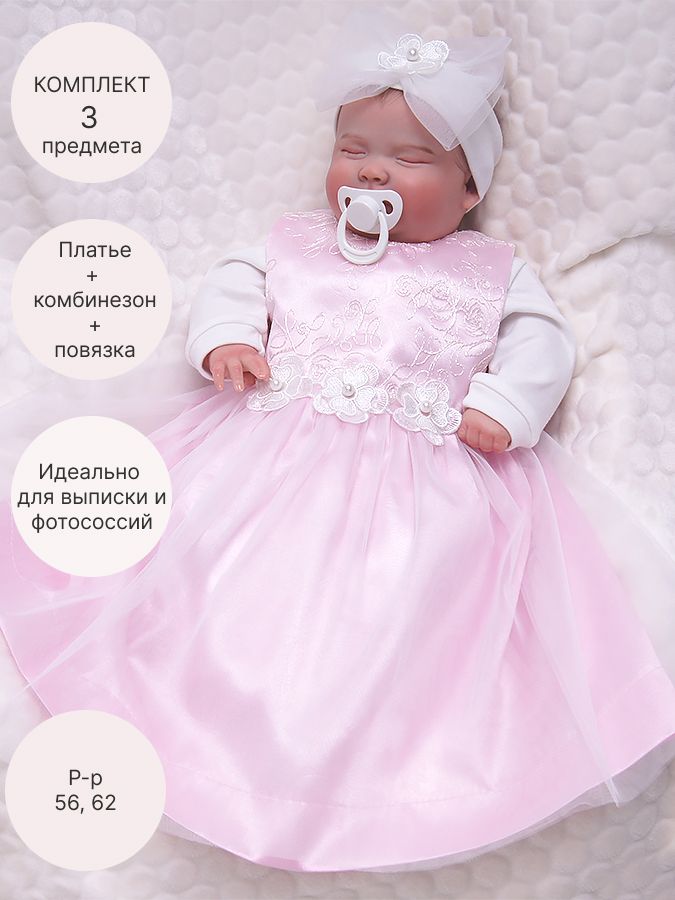 Комплект нарядного трикотажа прекрасный выбор как для выписки малыша из роддома, так и для первых выходов в свет. В комплекте комбинезон, платье и повязка. На первой в своей жизни фото сессии малышка будет неотразима.