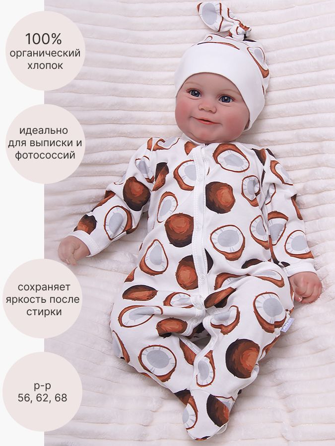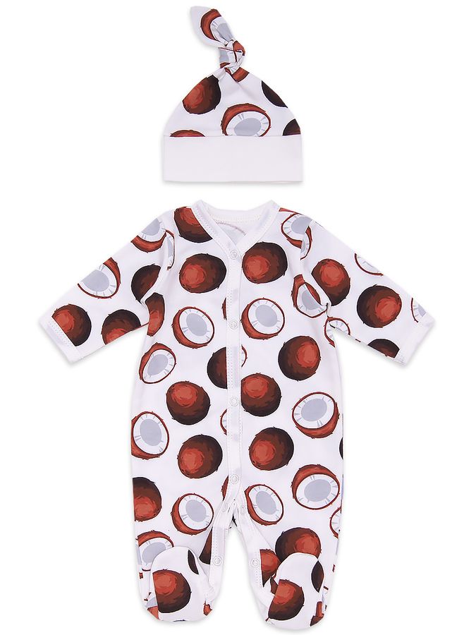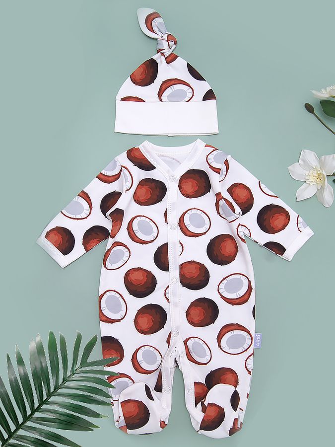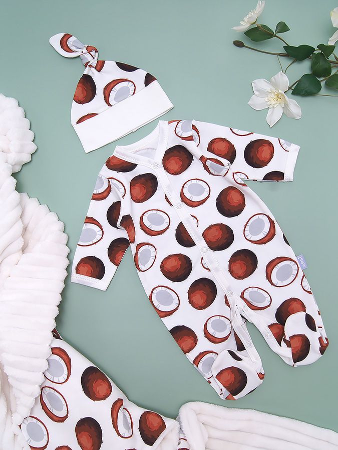 Комплект трикотажный из интерлока с ультра модным принтом кокосы. Подойдет для выписки и прогулок.