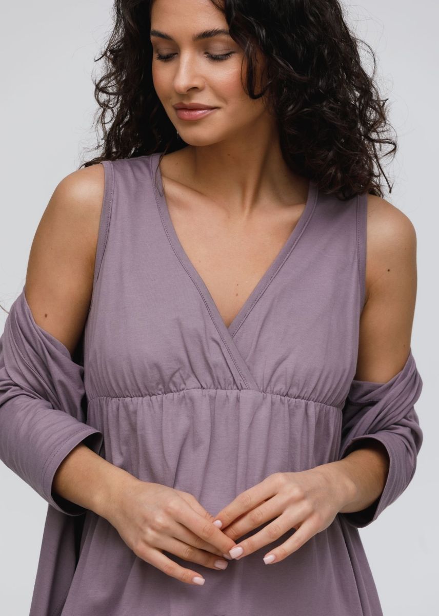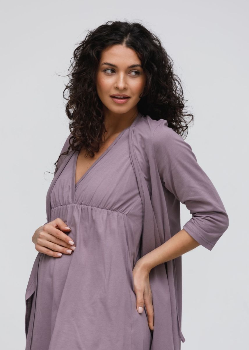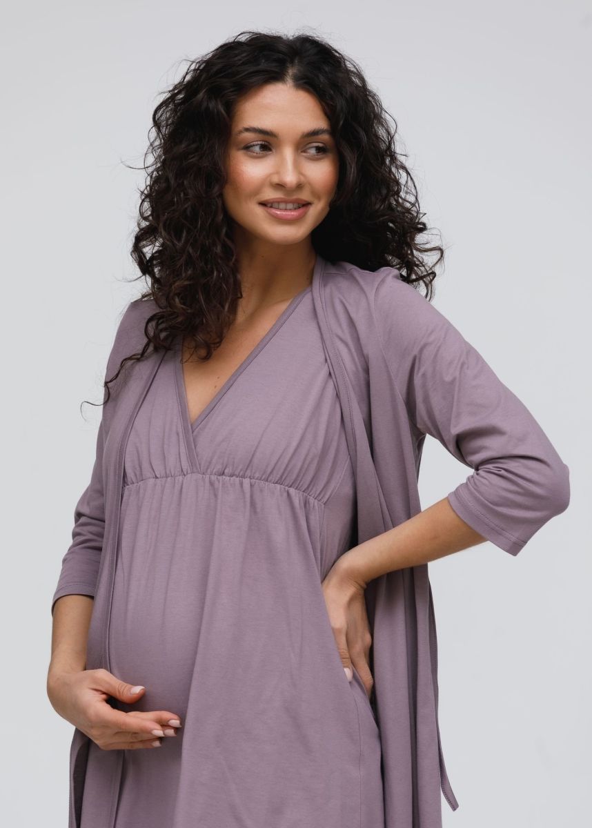 Комплект для роддома, состоит из халата и ночной сорочки. Халат с рукавом 3/4, с внешней и внутренней стороны фиксируется трикотажными завязками. Сорочка с высокой посадкой, подрез под грудью обработан внутри мягкой резинкой, которая образует сборочку, что придает дополнительный объем и свободу растущему животику.