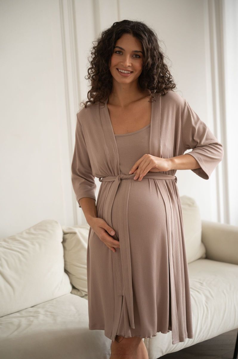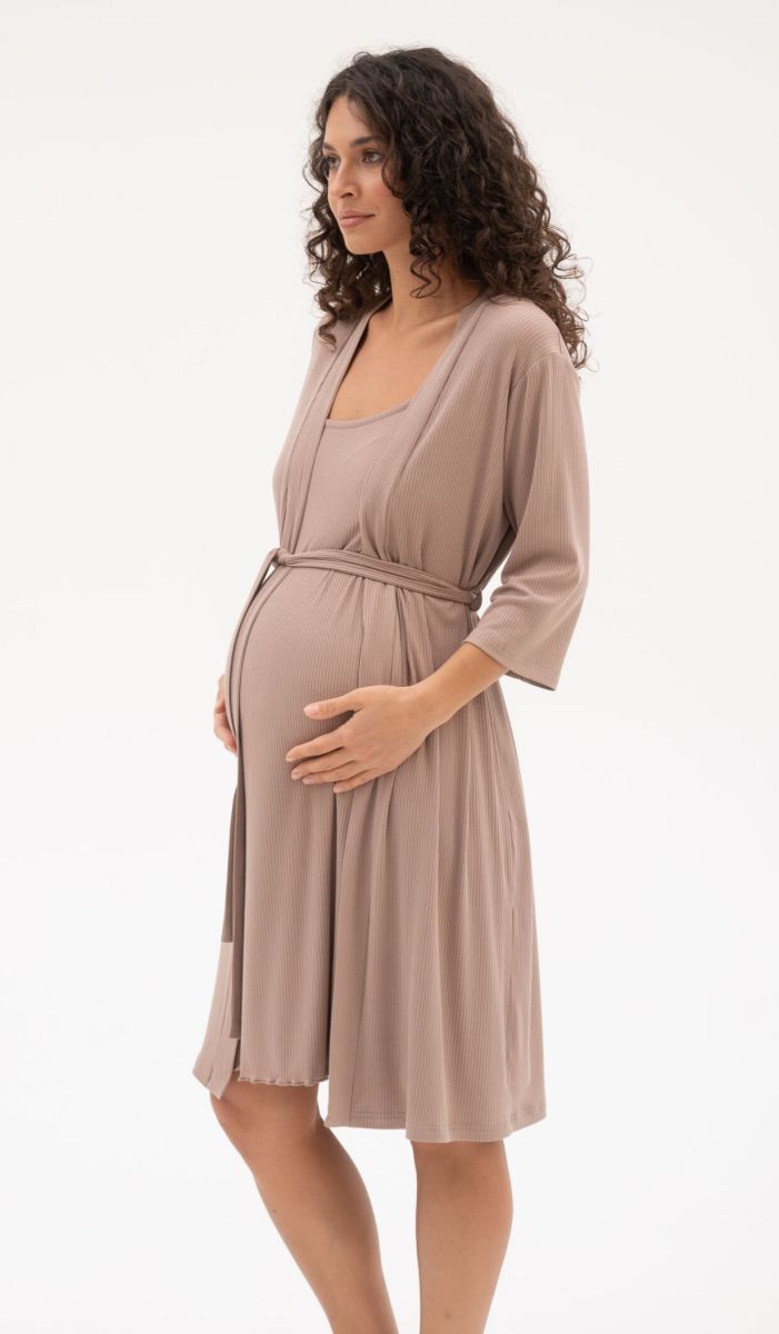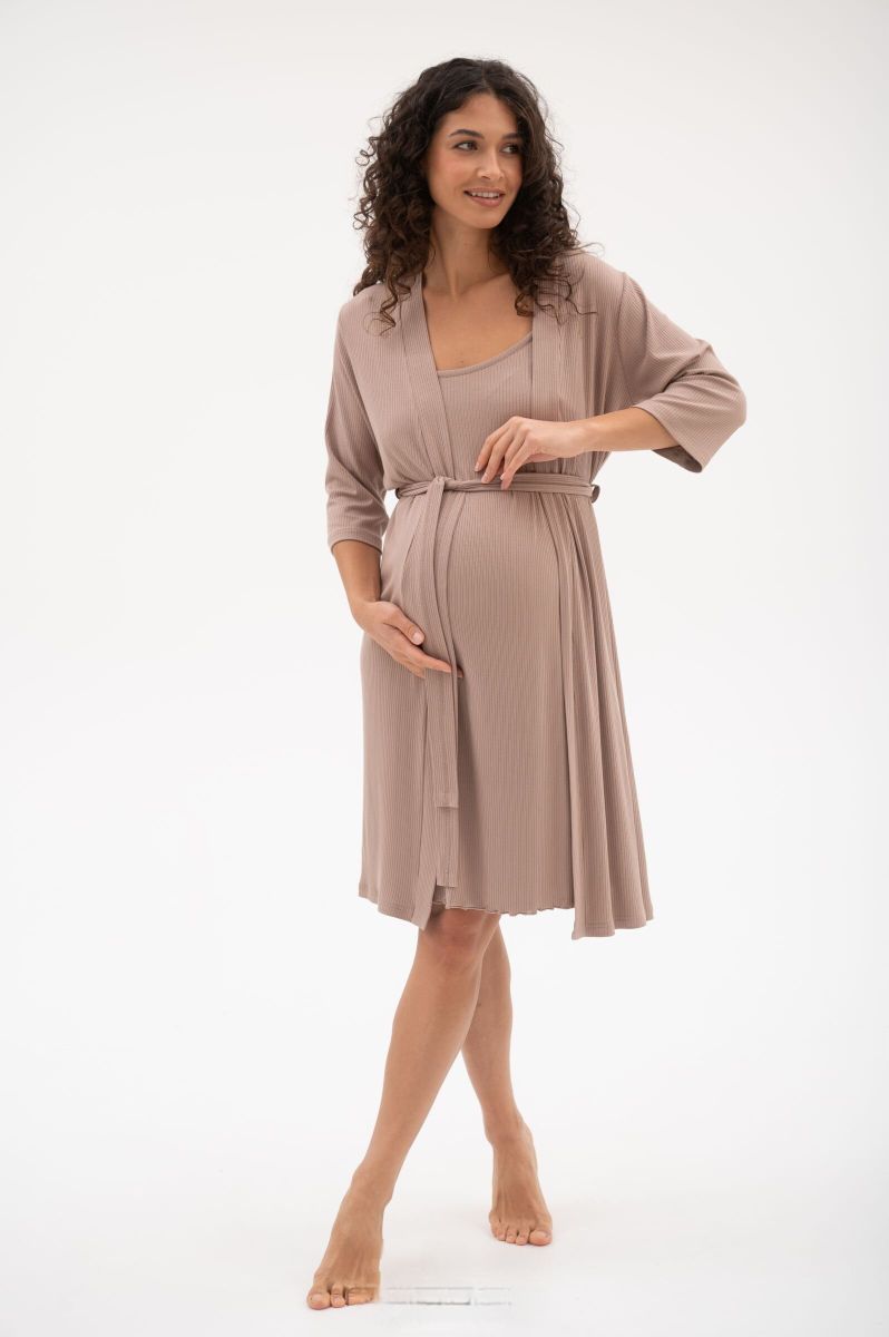 Комплект для роддома, состоит из халата и ночной сорочки. Халат со съёмным поясом. Сорочка на узких бретелях с регулятором длины. Секрет для кормления-застёжка-клипса, которая отстёгивается одним движением руки. Комплект выполнен из мягкого вискозного трикотажа-"лапша".