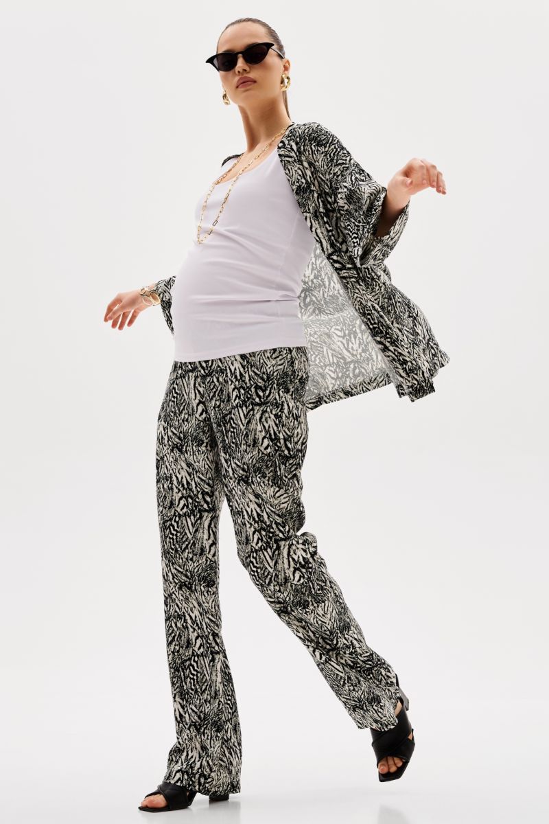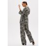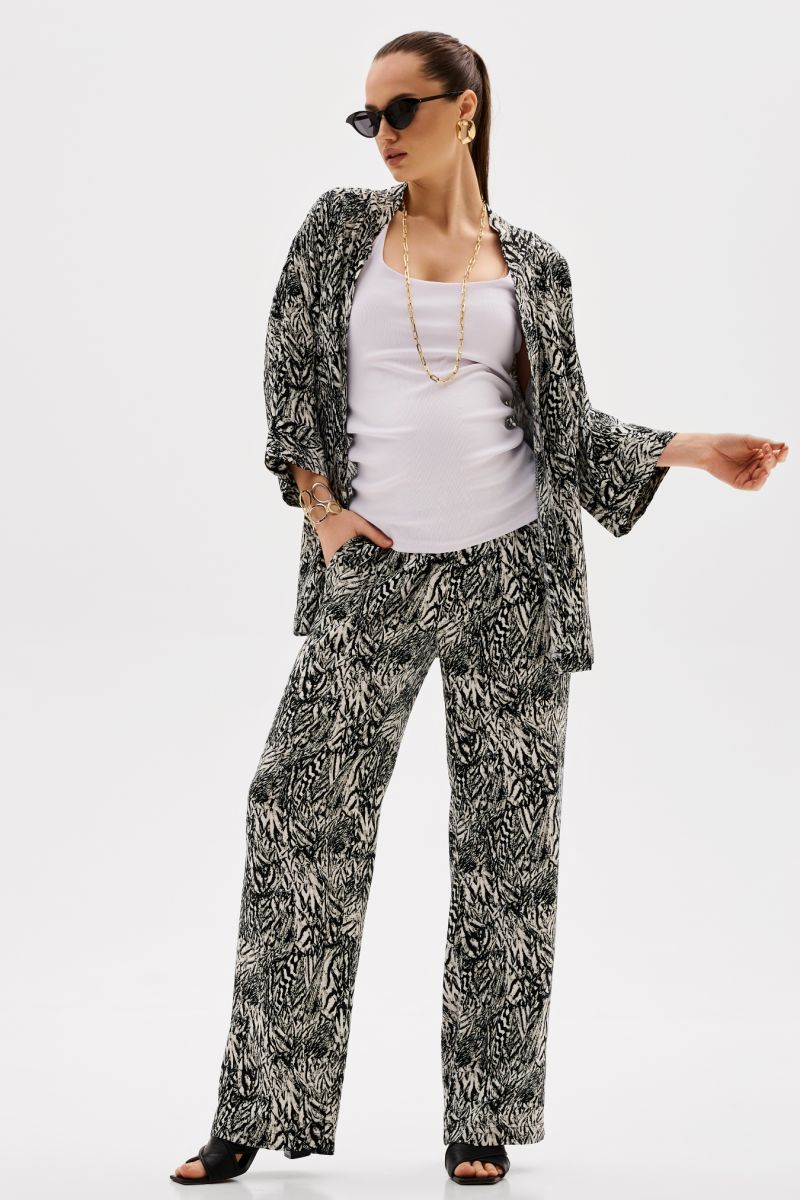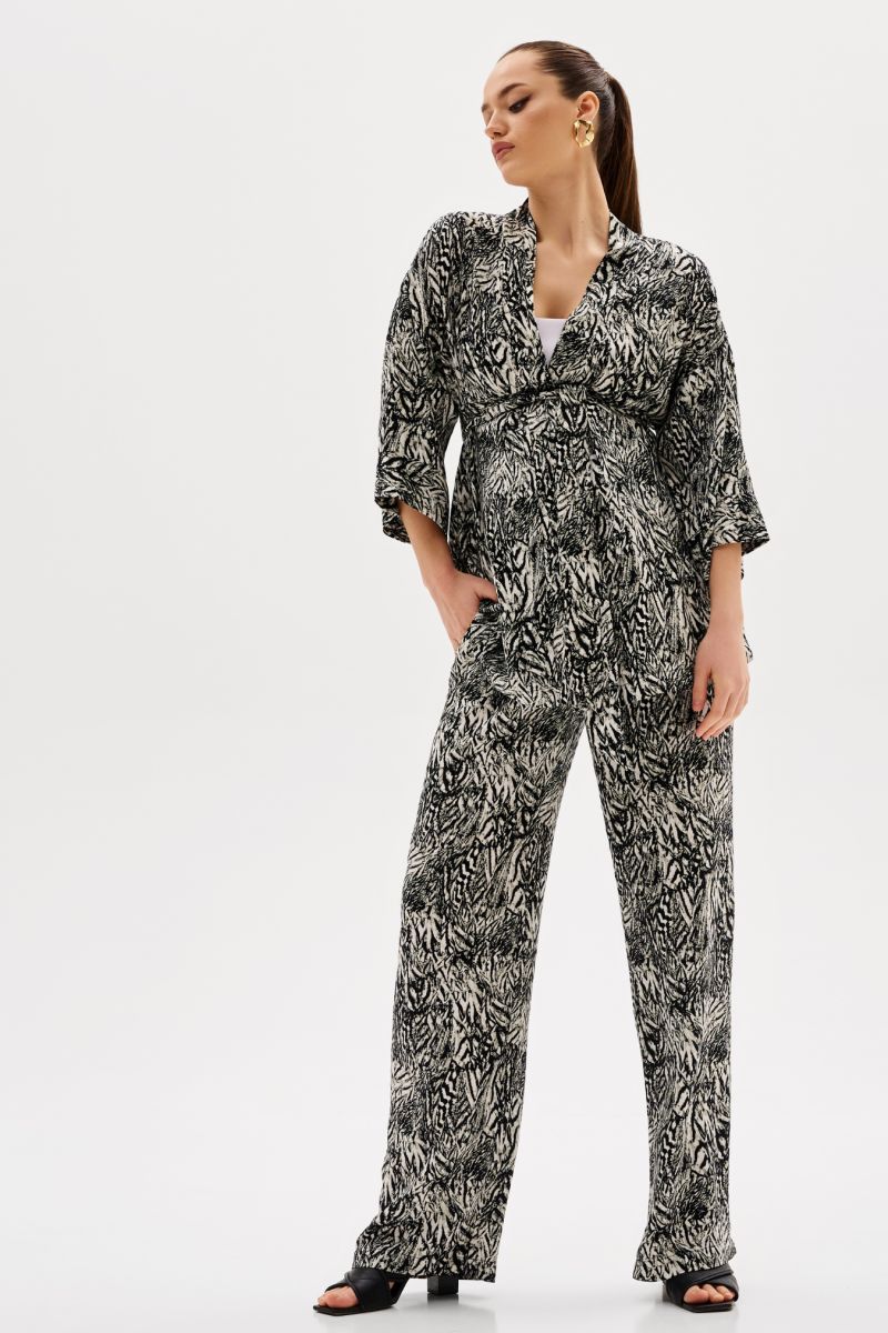 Легкий брючный костюм с модным звериным принтом. Комплект женский состоит из жакета и брюк. Жакет просторный, плечо спущено, рукава укороченные 3/4 с манжетами.