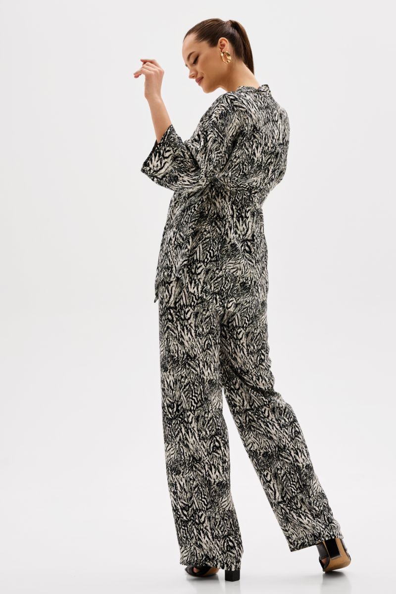 На спинке в шве кокетки складка для дополнительного удобства в движении. По всему периметру полочки и горловины широкая планка, застежка отсутствует, фиксируется с помощью тканевого пояса. Брюки свободные в стиле палаццо, с поясом на резинке по спинке, есть боковые карманы.