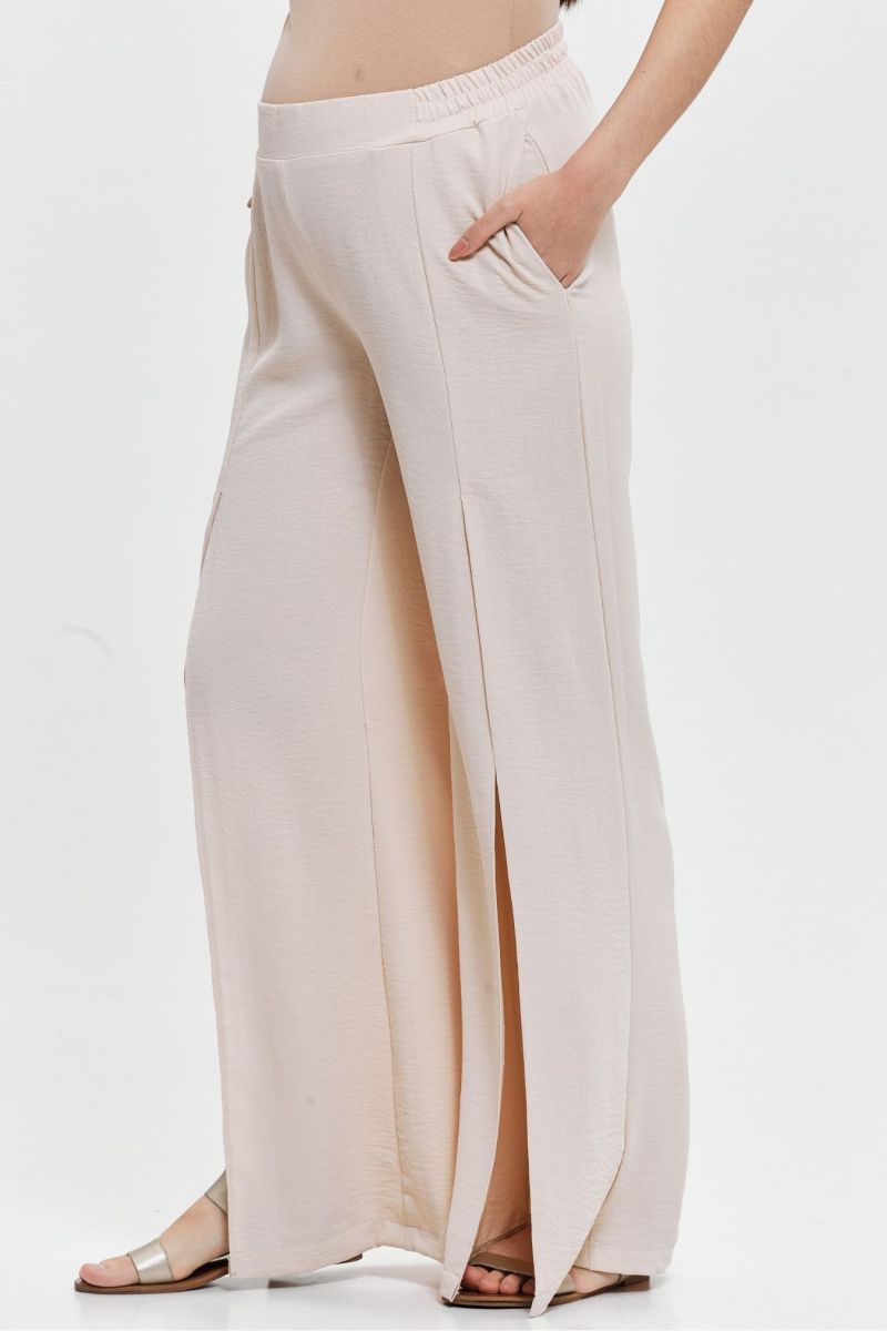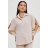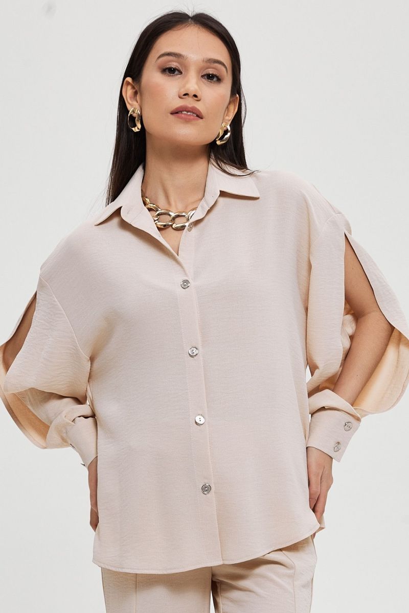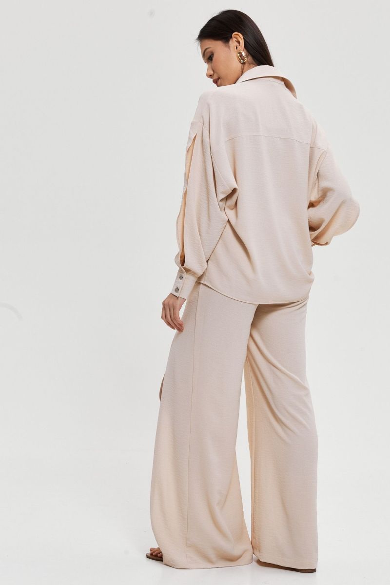 Брючный костюм для беременных кремового оттенка из приятного крэш материала (жатая ткань). Комплект женский состоит из рубашки и брюк. Дизайн оригинальный и не оставит Вас без внимания. Рубашка в стиле оверсайз, отложной воротник переходит в планку на контрастных пуговицах. Плечо спущено, рукава свободные с разрезами по плечевому шву и широкими манжетами на пуговицах. При желании их можно застегнуть или оставить в свободном падении. Брюки широкие в стиле палаццо с боковыми карманами. Пояс сзади на резинке, спереди на тканевой вставке. Хорошо сядут на фигуру на любом сроке. Изюминкой образа являются высокие разрезы. Модель подойдет для теплого весеннего/ осеннего периода и прохладного лета. Легкий нарядный комплект двойка подойдет для прогулки, на праздник, как подарок подруге.