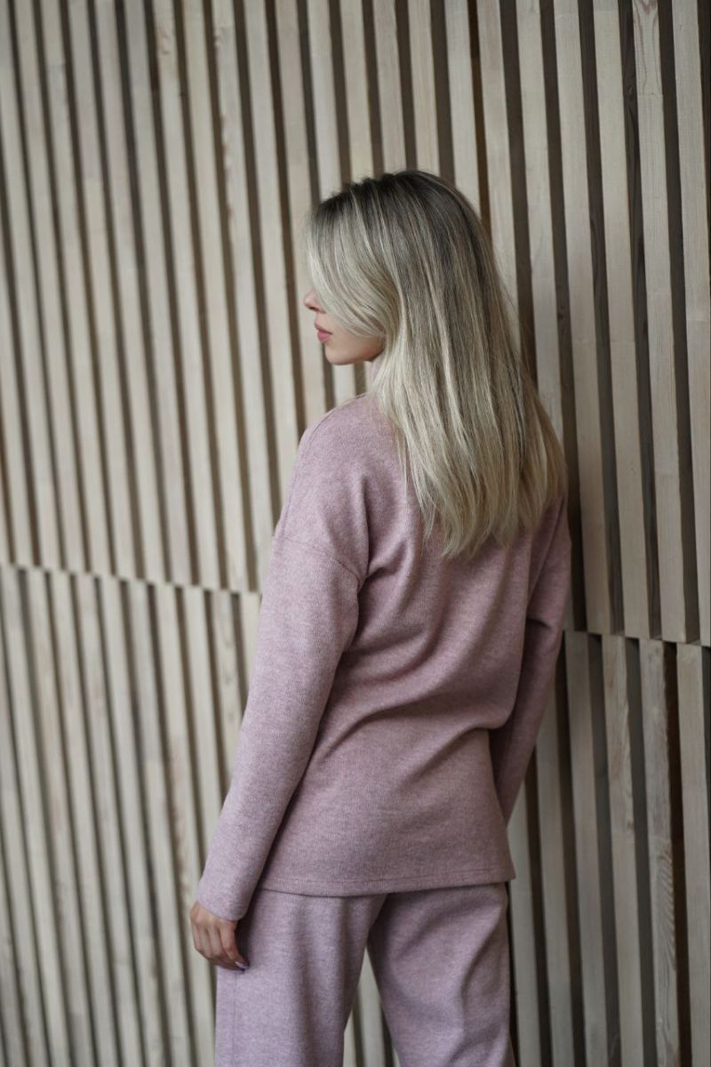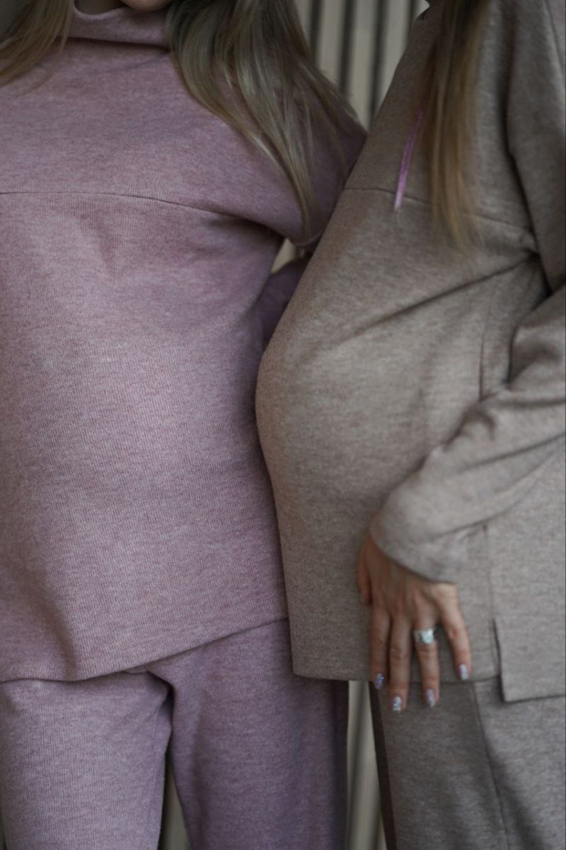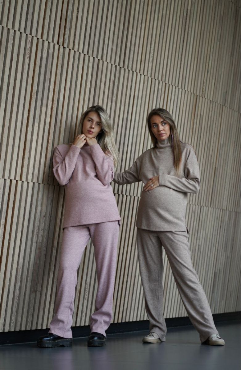 Костюм из тёплого трикотажа, состоит из худи и брюк. Худи с воротником стойкой, по полочке кокетка с молнией для кормления. Брюки с двойной вставкой, первая - пояс под живот, вторая из вискозы, ее можно впоследствии убрать.