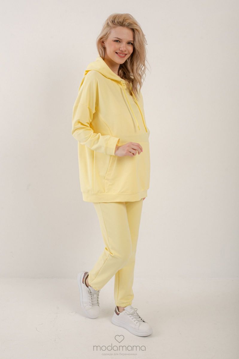 Костюм спортивный для беременных и кормящих мам. Свитшот свободного кроя со спущенным рукавом и карманом-"кенгуру". Секрет для кормления-вертикальные замки-"молнии" в рельефах на груди. Брюки с подрезными карманами и резинкой по низу, имеют двойной бандаж: верхний трикотажный бандаж во время беременности регулируется пуговкой по верху, а после родов его можно убрать и носить как обычные брюки. Костюм выполнен из мягкого трикотажного полотна (футер 2-х нитка).