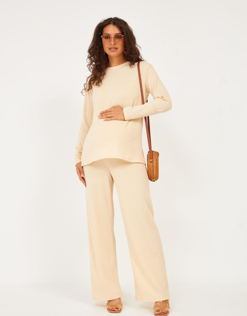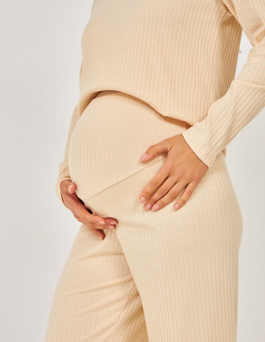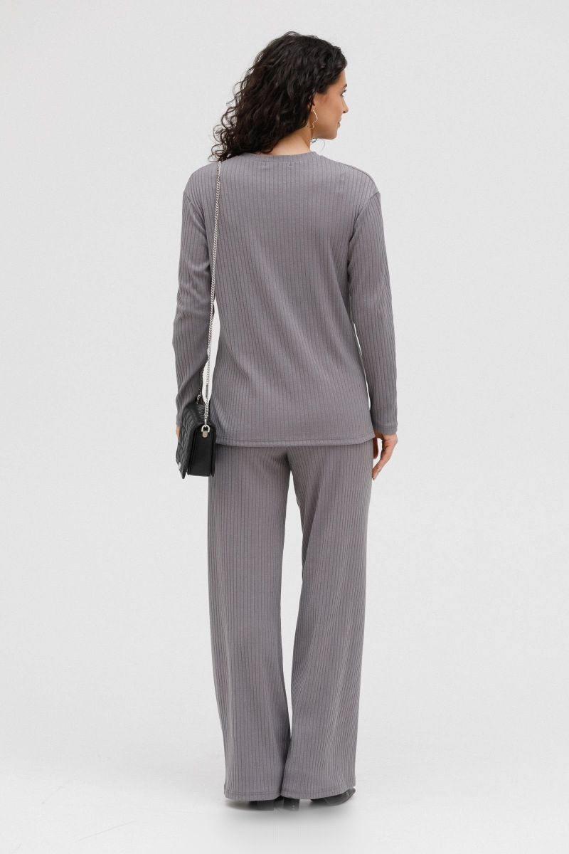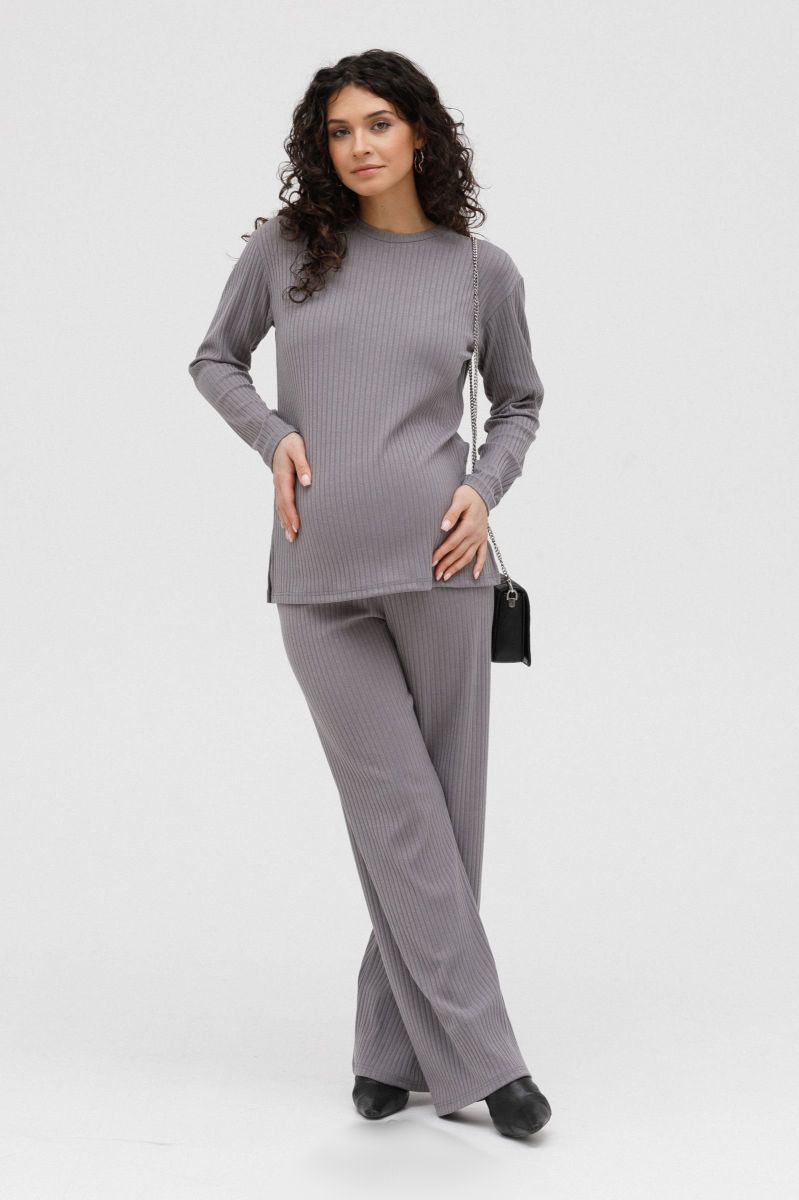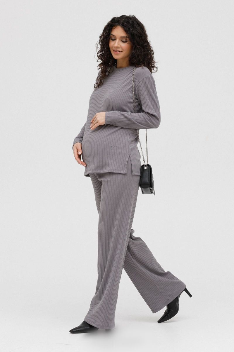 Брючный костюм для беременных из мягкого, эластичного трикотажа-"лапша". Прямой силуэт джемпера с разрезами по бокам позволяет носить его как во время, так и после беременности. Широкие брюки без бокового шва с высоким круговым бандажом из основной ткани регулируются пуговкой по верху. Каждый элемент костюма можно носить по отдельности и сочетать с другими вещами в гардеробе.