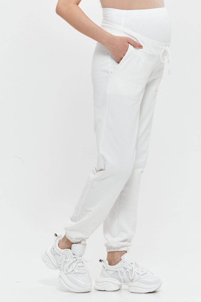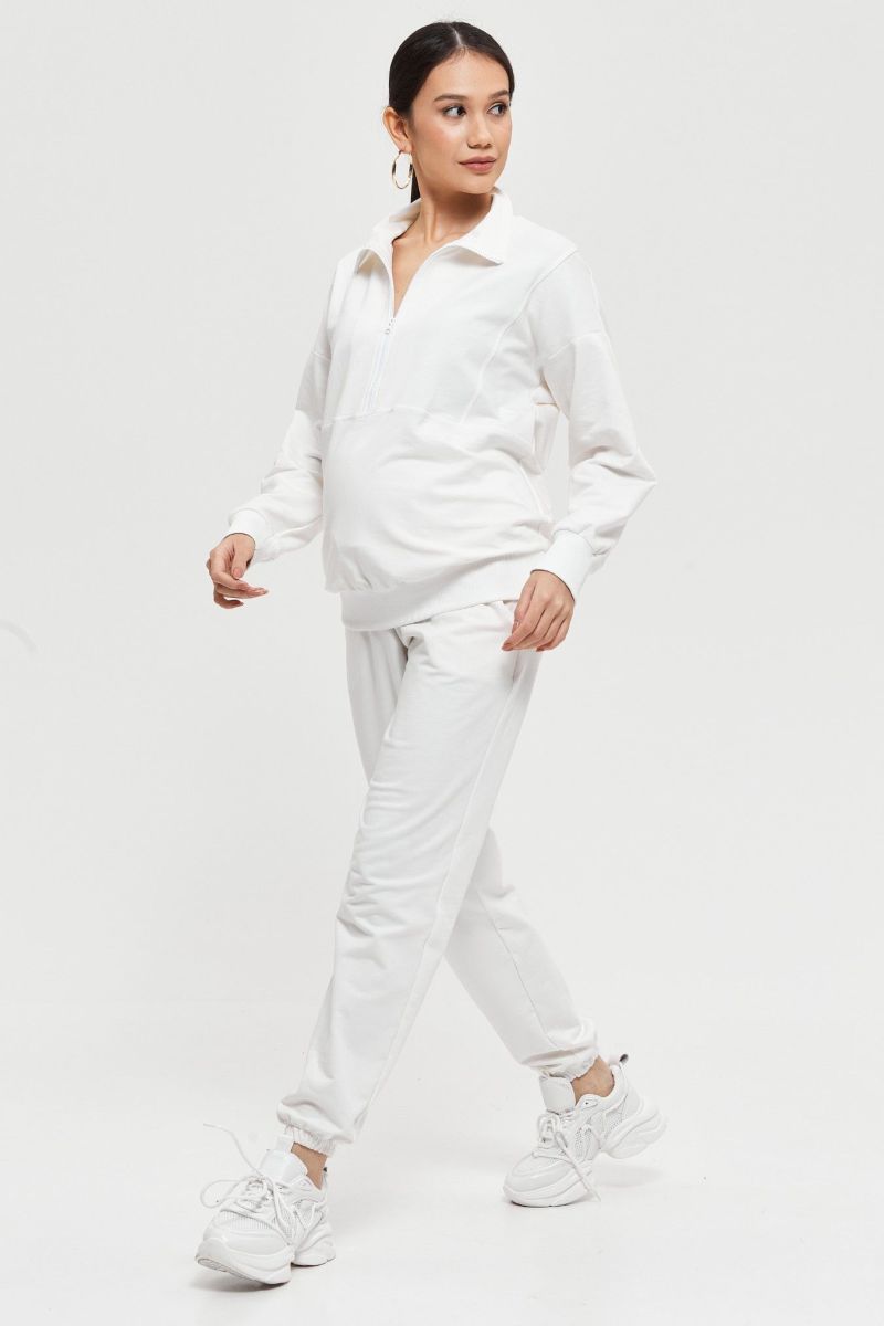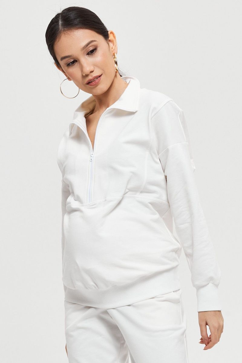 Костюм для беременных и кормящих мам из мягкого 2х-ниточного футера молочного оттенка. Состоит из джемпера и брюк. Универсальная модель, в которой будущей маме будет комфортно на всем сроке и после родов. Джемпер имеет воротник-стойку и глубокую молнию на груди, расстегнув которую модель можно использовать для кормления. Рукав длинный свободный со спущенным плечом. Низ рукавов и джемпера на манжетах. Брюки просторного силуэта, имеют боковые карманы, дополнены трикотажным бандажом для поддержания животика. Низ брюк на резинке. Отрегулировать объем поможет потайная резинка с пуговицей. Отличный вариант для прохладного сезона. Комплект подойдет как одежда для кормления женская, трикотажный спортивный наряд двойка больших размеров, как подарок подруге. Подойдет для высоких, невысоких и среднего роста девушек.