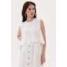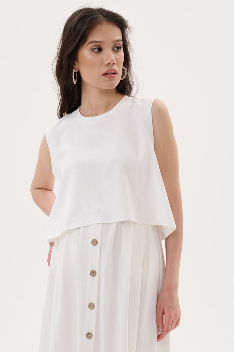 Топ свободного силуэта с ассиметричным низом и удлинением по спинке. Аккуратная круглая горловина и проймы обработаны обтачкой, а на спинке застежка для удобства.