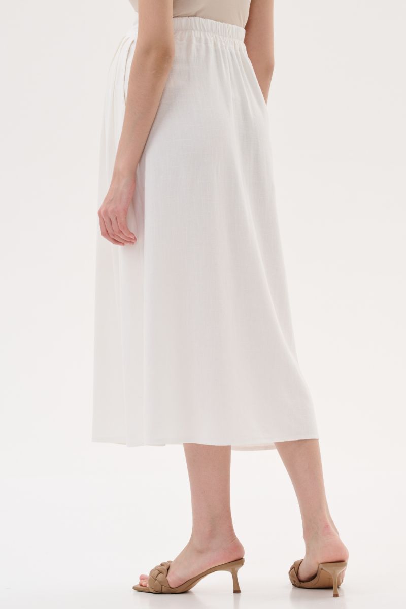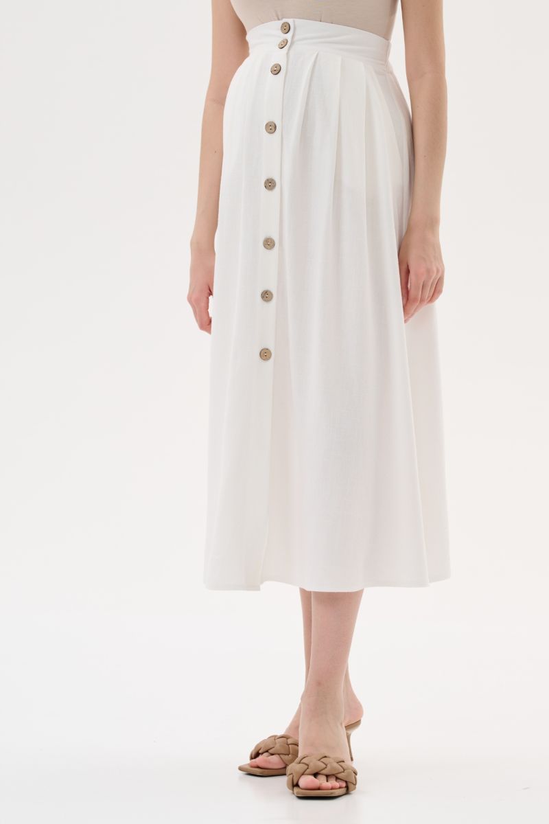 Юбка миди с широким поясом, посаженным на резинку по спинке. Складочки добавят дополнительный объем для растущего животика, что позволит носить наряд на всем сроке и после родов. Деревянные пуговицы на юбке выполняют и декоративную, и функциональную роль,разбавят минималистичный дизайн и добавят образу изюминку.