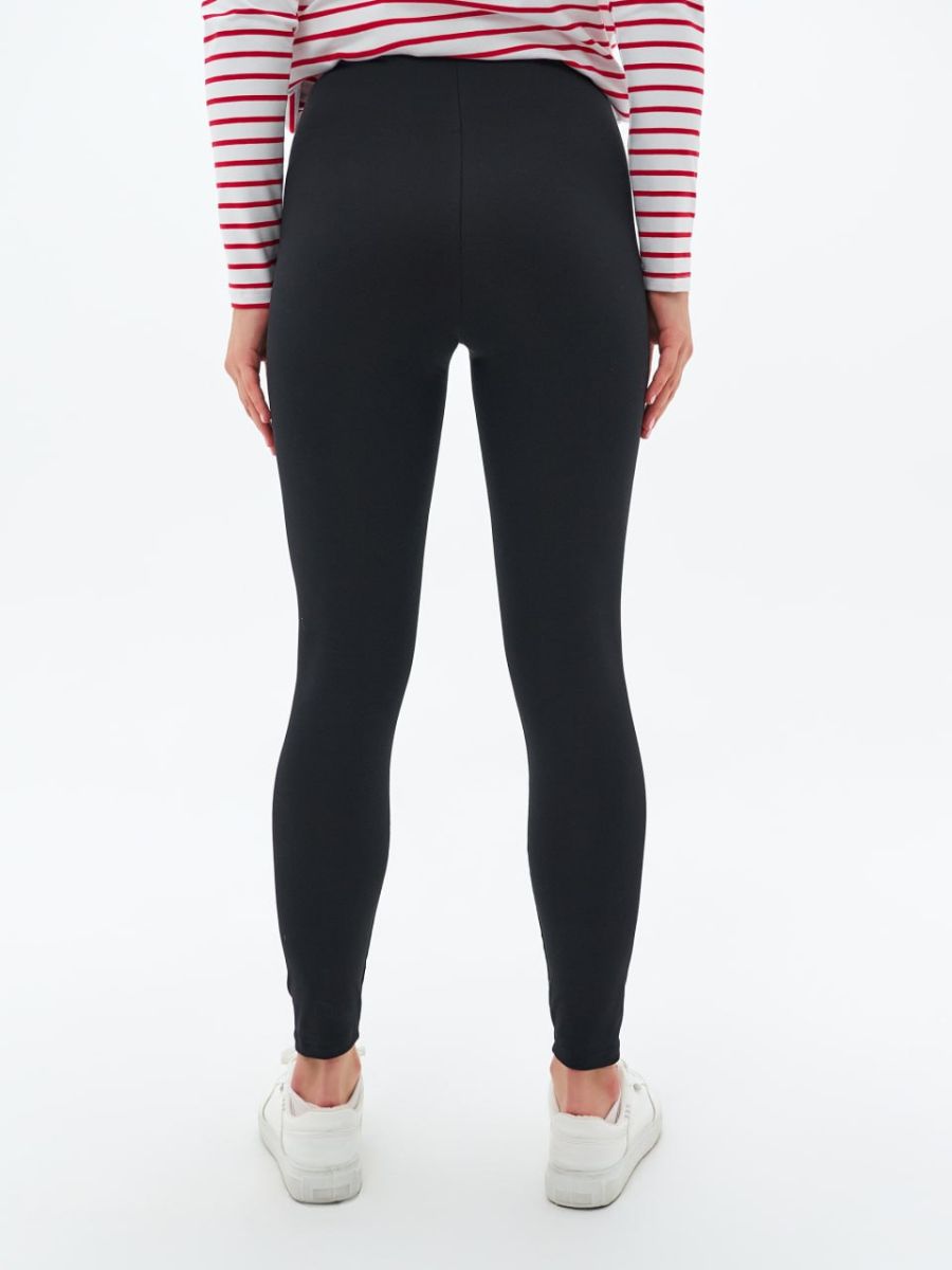 Классическая базовая модель леггинсов выполнена из плотного эластичного хлопка. Высокая бандажная вставка на животик регулируется пуговкой сверху. Не просвечивают.