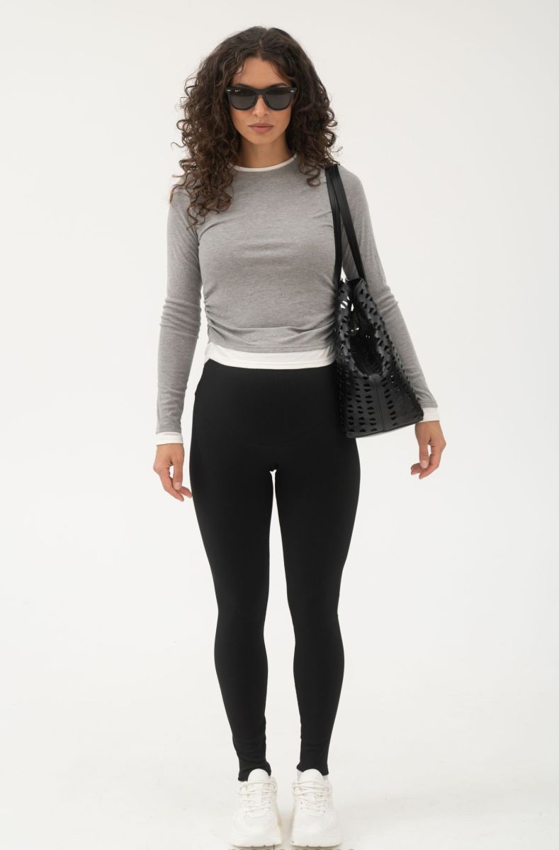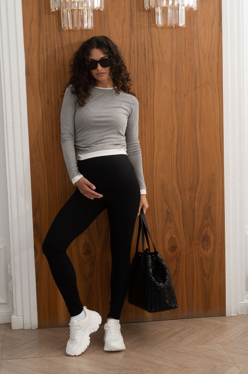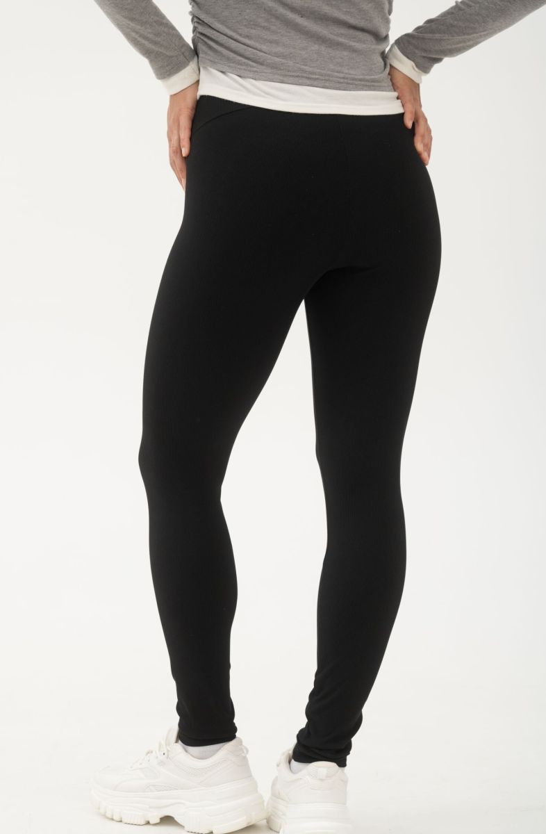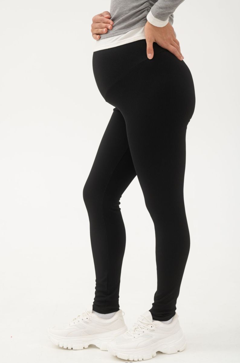 Леггинсы для беременных из тонкого, эластичного трикотажа-"лапша" с узким рубчиком. Хорошо держат форму. Высокий круговой трикотажный бандаж из основной ткани регулируется пуговкой сверху.