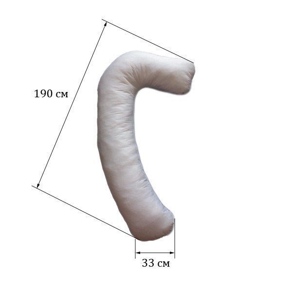 Размер 150см, по внешнему краю 200см, ширина "ноги" 35 см, наполнитель комфорель (синтепух, скрученный в маленькие плотные шарики - гипоаллергенный, без запаха, не слеживается, не шуршит), вес 1500 г.