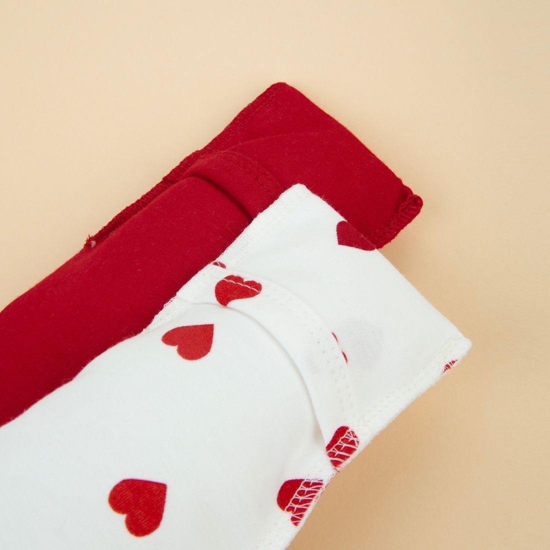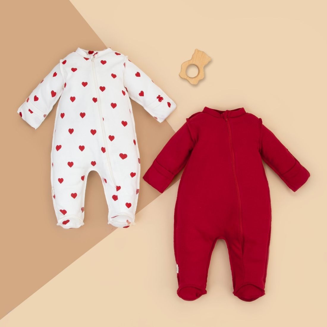 Набор для новорожденного из интерлока, отделка бейкой. Состоит из двух комбинезонов. 1 комбинезон - яркий принт "Сердечки", 2 комбинезон - однотонный (красный)