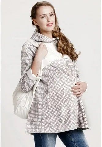 Плащ для беременной "Ажен" силуэта трапеция подойдет девушкам на большом сроке - животик поместится благодаря правильному крою. Расцветка "звездочки", воротник переходит в капюшон, рукава - втачные с контрастными отворотами, на плече - погоны с пуговицей. Застежка двусторонняя в виде молнии, на груди однотонная кокетка, подчеркивающая красоту фасона. Карманы на молнии прикрыты листочкой.
