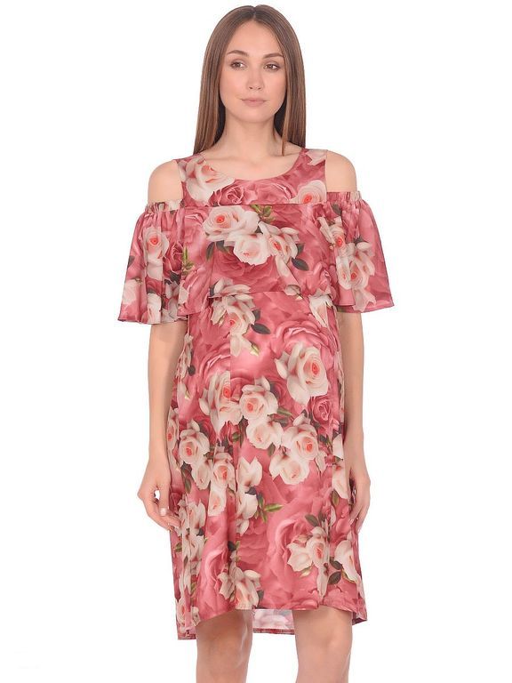 Модный фасон с открытым плечом и круговым воланом на груди. Под воланом есть молния для кормления.