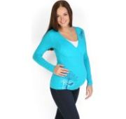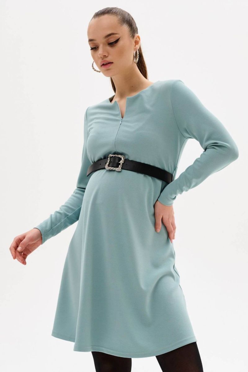 Платье для беременных женское мятного цвета длиной чуть выше колен. Аккуратная круглая горловина дополнена потайной молнией, что придает платью нотку оригинальности и дает возможность при необходимости покормить малыша.