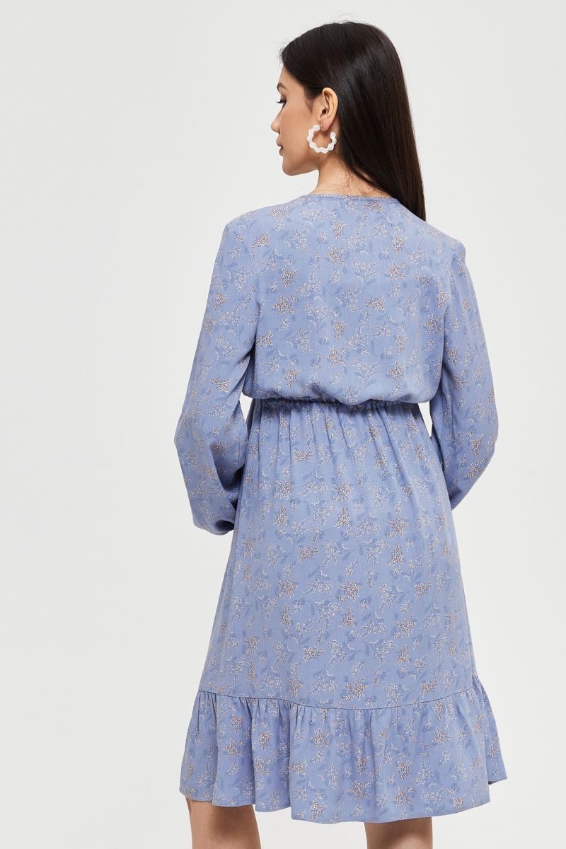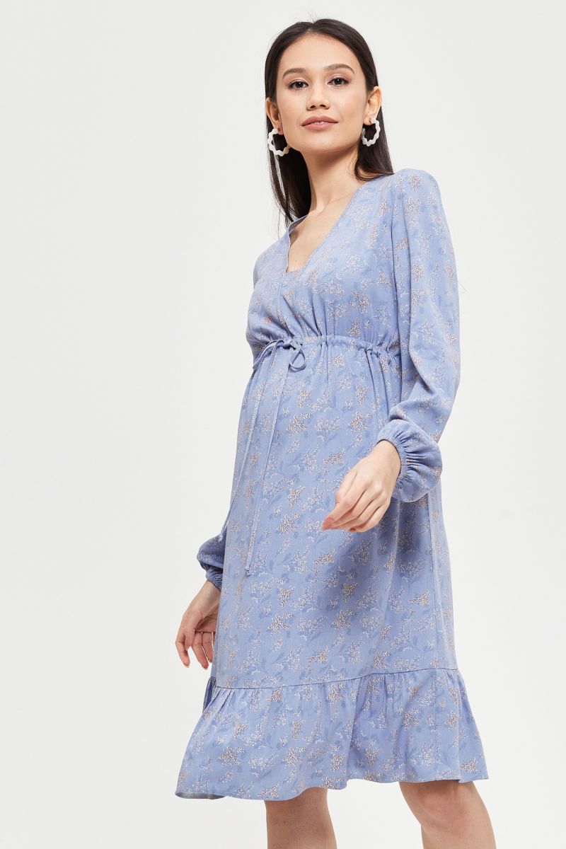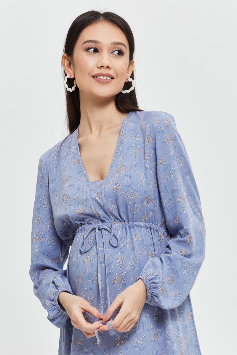 Платье для беременных повседневное из приятной ткани голубого оттенка с цветочным принтом. Свободная комфортная модель с хлопком в составе и длиной до колен отлично впишется в легкий, динамичный образ.
