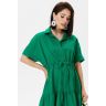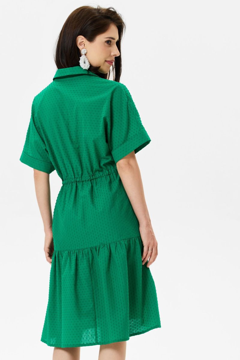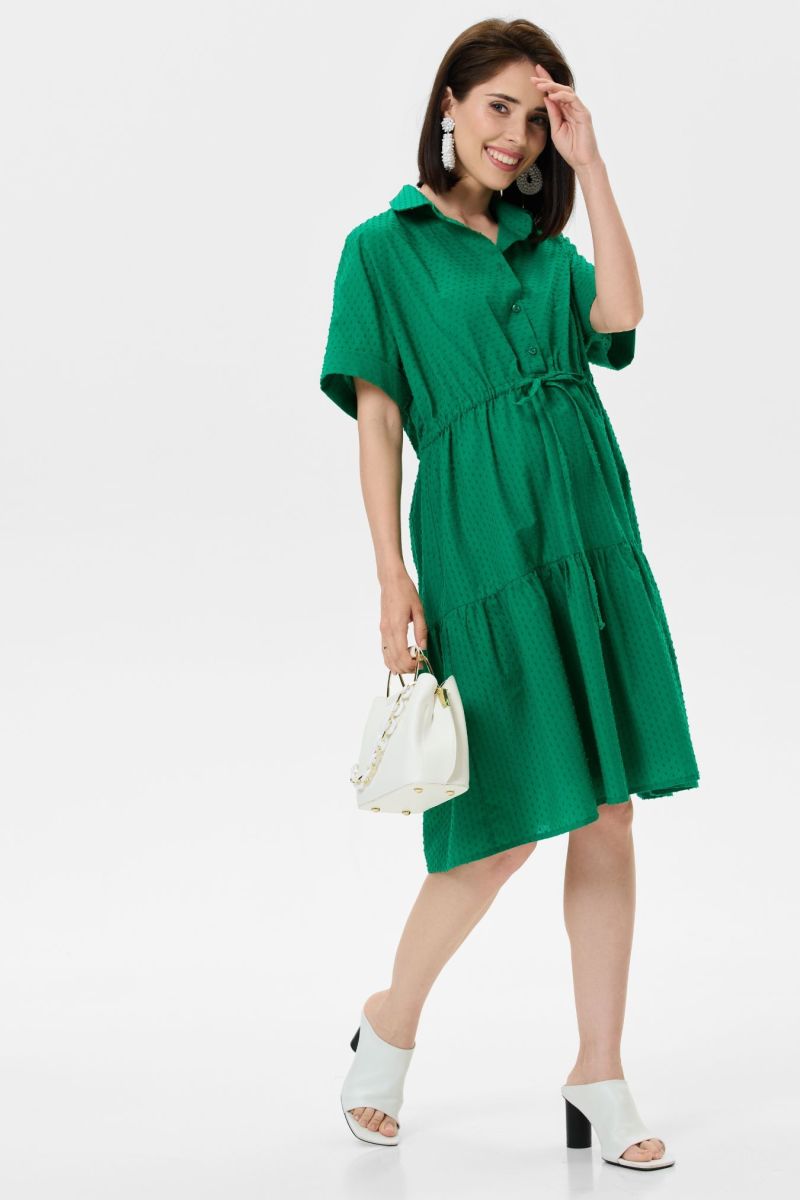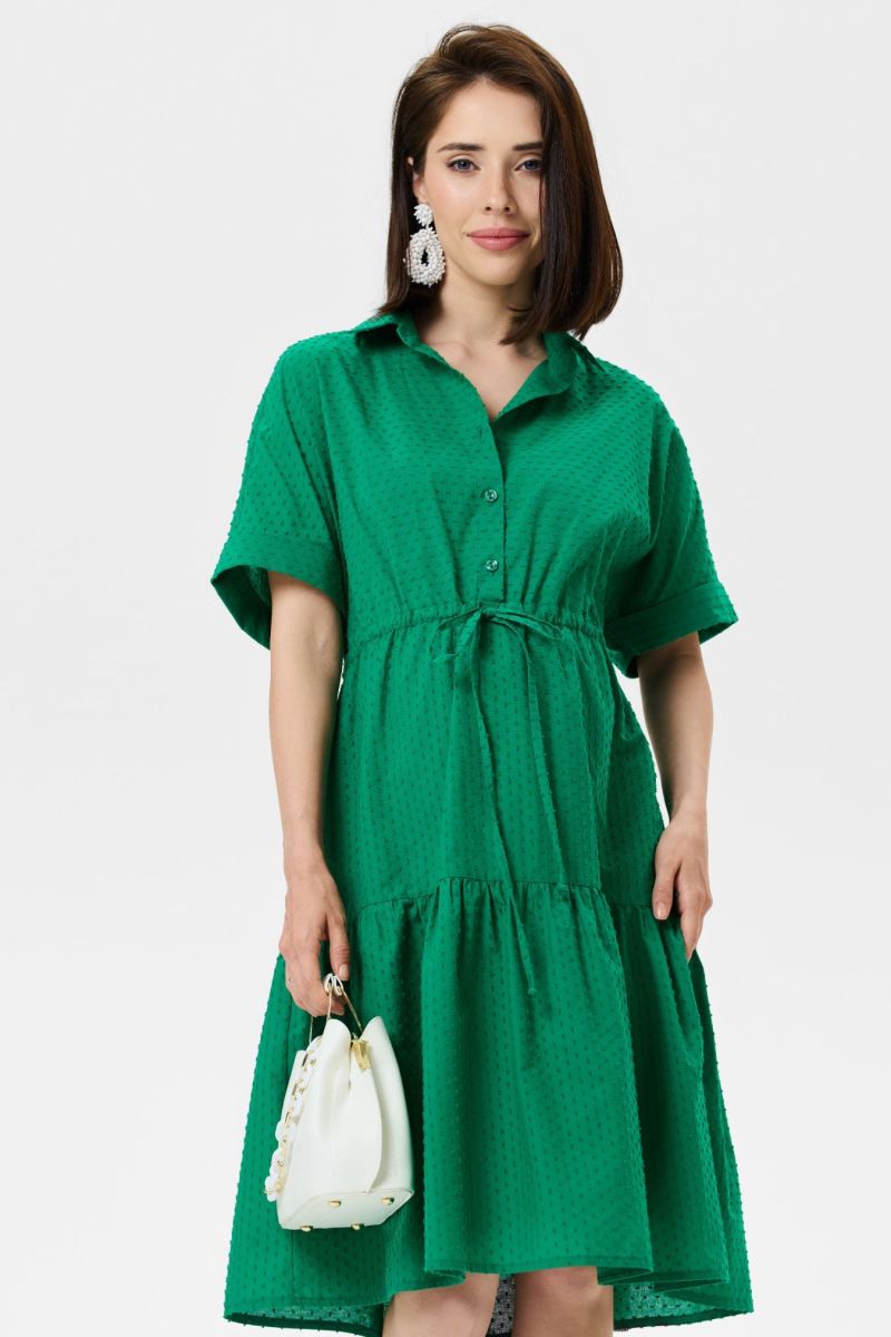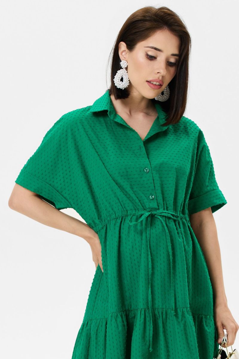 Платье для беременных с коротким рукавом сочного зеленого цвета длиной до колен идеально для жаркого сезона. Крой лаконичный, рубашечный воротник плавно перетекает в планку на пуговицах, свободные цельнокроеные рукава с манжетами не стесняют движений и будут комфортны в носке.