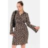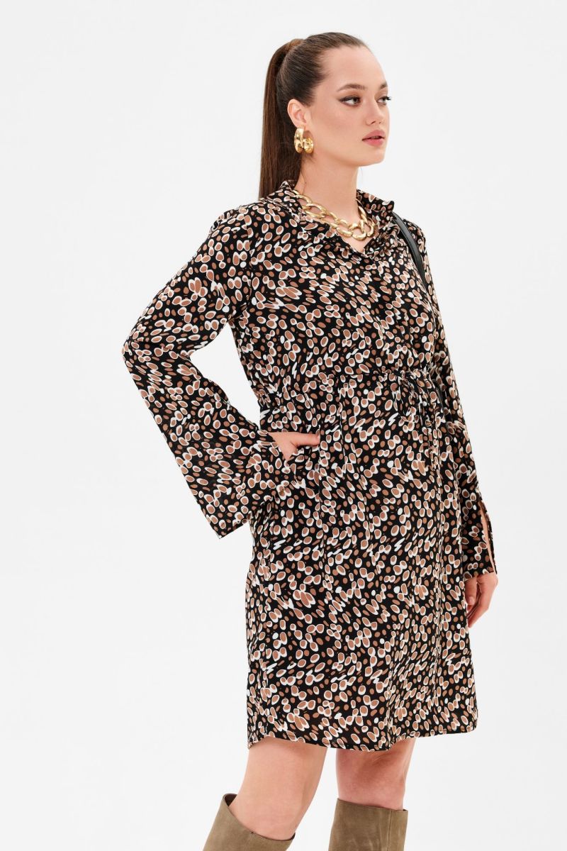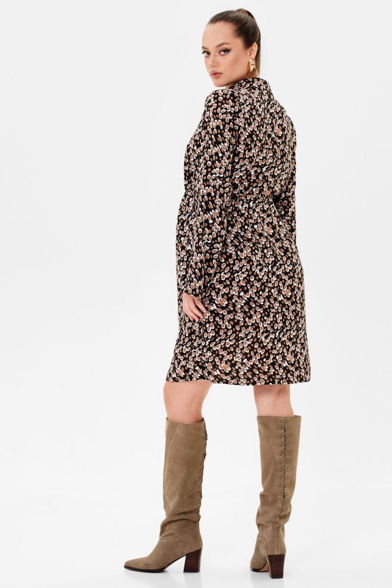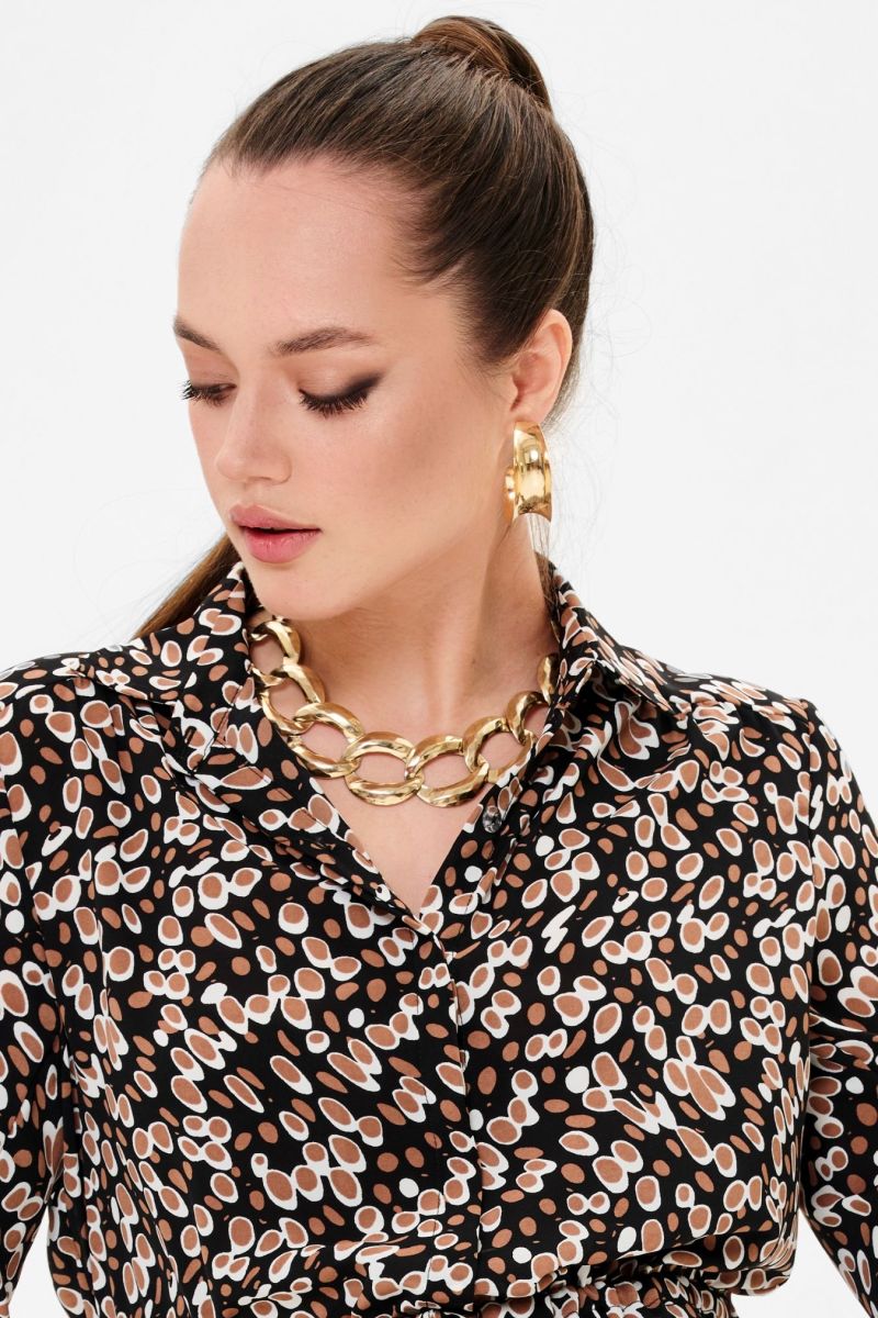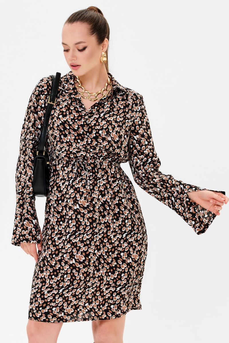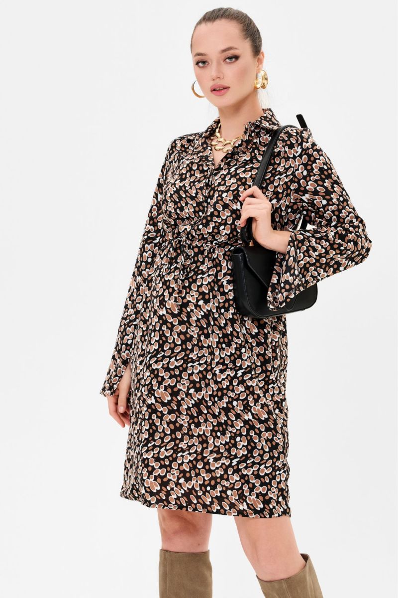 Платье для беременных нарядное с анималистическим принтом длиной до колен из приятного мягкого материала. Модель имеет рубашечный воротник и планку с потайными пуговицами в области груди.