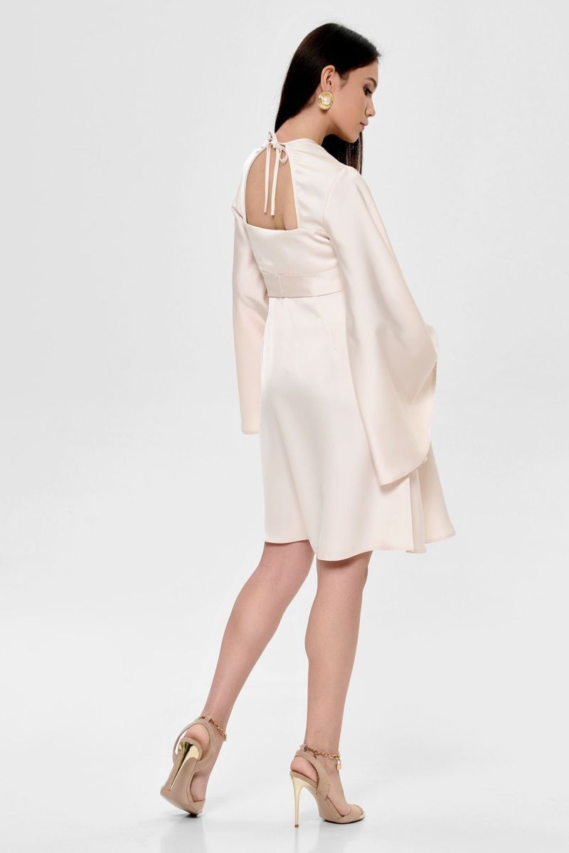 Аккуратная круглая горловина переходит в завязку-тесьму на спинке.Оригинальная фигурная открытая спинка добавит образу кокетства.Модные расклешенные к низу рукава и юбка гармонично дополняют друг друга и придадут наряду воздушности и романтичности.