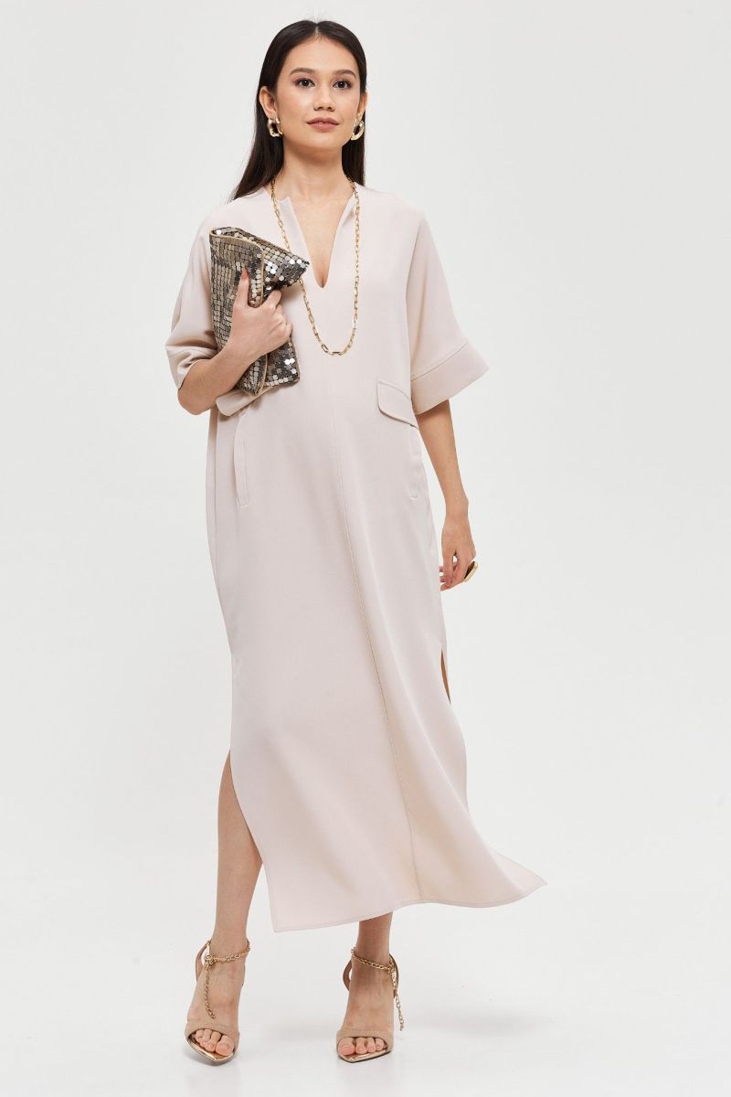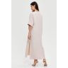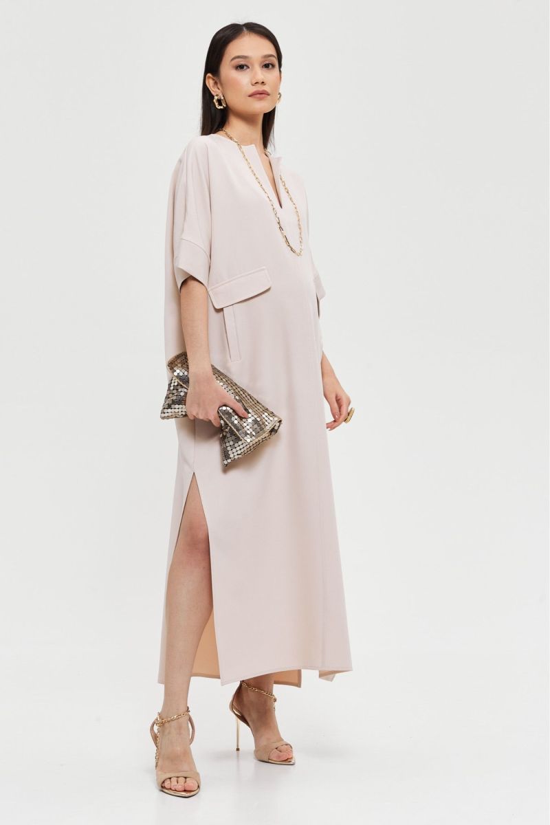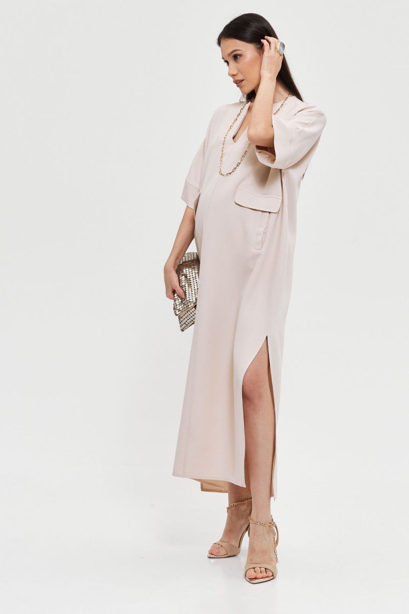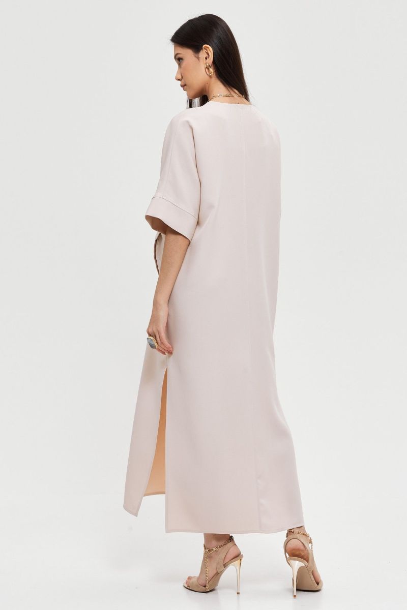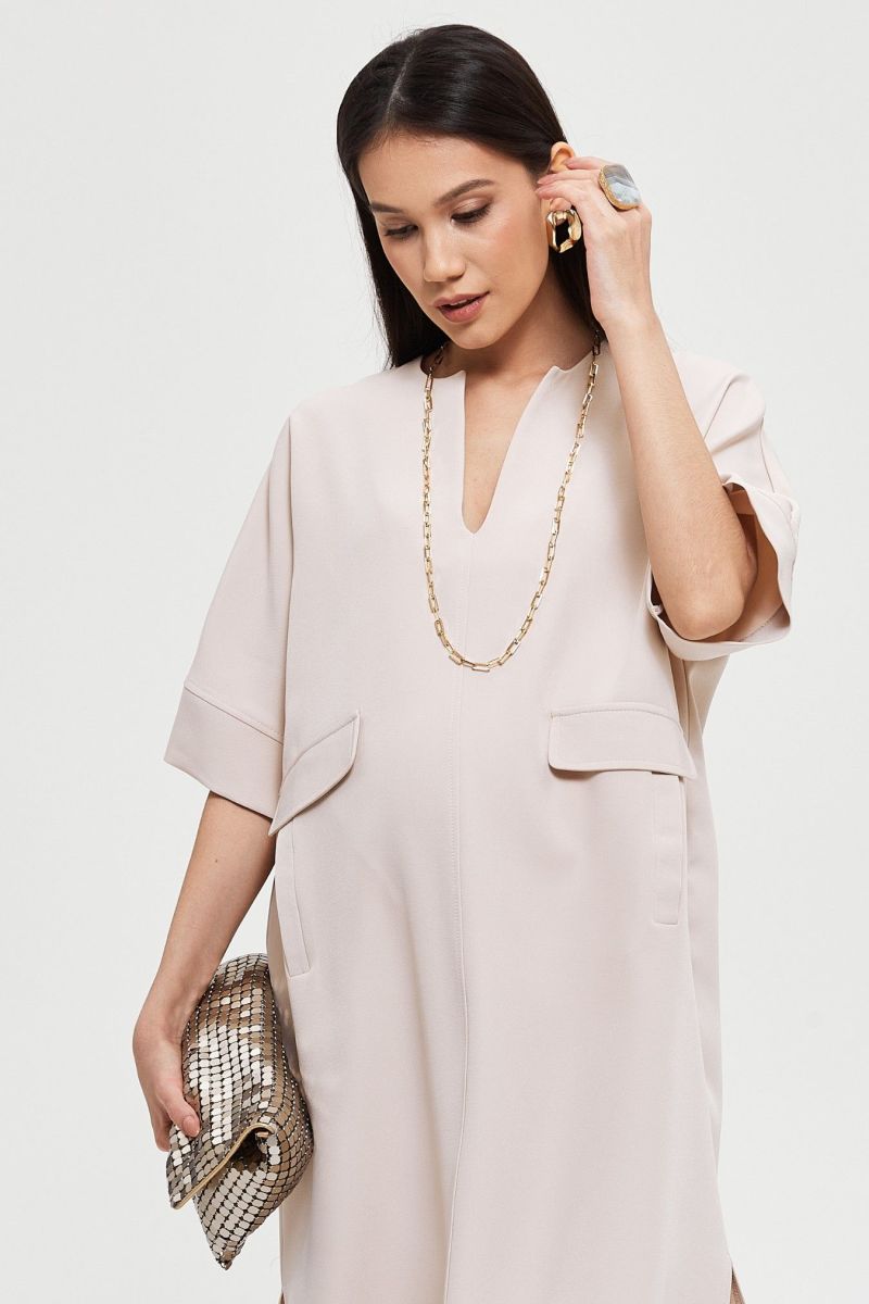 Платье для беременных повседневное нежного бежевого оттенка. Модель макси имеет округлую горловину, переходящую в V-образный вырез. Цельнокроеные укороченные рукава с широкой планкой мягко подчеркивают плечи. Прямой свободный силуэт дополнен высокими боковыми разрезами, которые добавят удобства при ходьбе. Оригинальные прорезные карманы с клапаном разбавят минималистичный образ, а крупные украшения и аксессуары добавят изюминку. Платье оверсайз можно носить на всем сроке беременности и после родов. Это отличный вариант для весеннего или летнего сезона. Модель подойдет как женское модное длинное платье в офис больших размеров, свободный легкий наряд макси, в качестве подарка подруге. Обувь к наряду можно подобрать любую - будь то каблук или низкий ход. Подойдет для высоких, невысоких, среднего роста девушек.